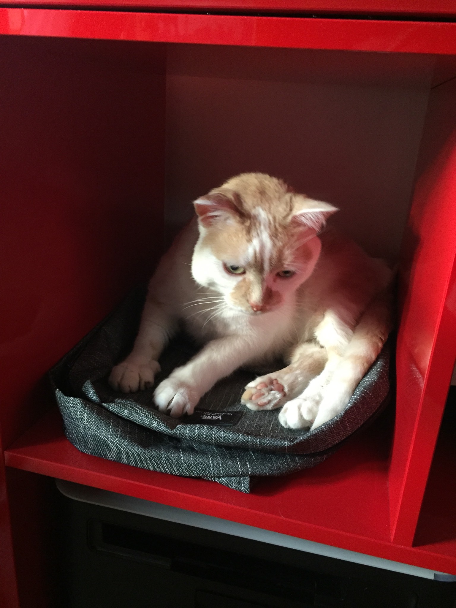 Caractère : Caramel est un chat calme et facile à vivre, il ne griffe jamais, il peut mordiller quand on le touche à un endroit qu’il n’apprécie pas. Il décide du moment et de la durée des câlins. Il viendra volontiers se blottir contre vous pour dormir. Ce n’est pas un chat grimpeur, il vit au sol. Il aime se coucher dans un simple carton mais ne dédaigne pas un panier ou un plaid moelleux. Il a une forte ossature ce qui le fait paraître massif mais il n’est pas gros malgré les apparences. Il comprend parfaitement le « non ». Il aime passer du temps sur le bord des fenêtres, il est donc impératif de les sécuriser. A adopter de préférence seul car il est dominateur avec ses congénères, dans une famille avec de grands enfants ou sans enfant.