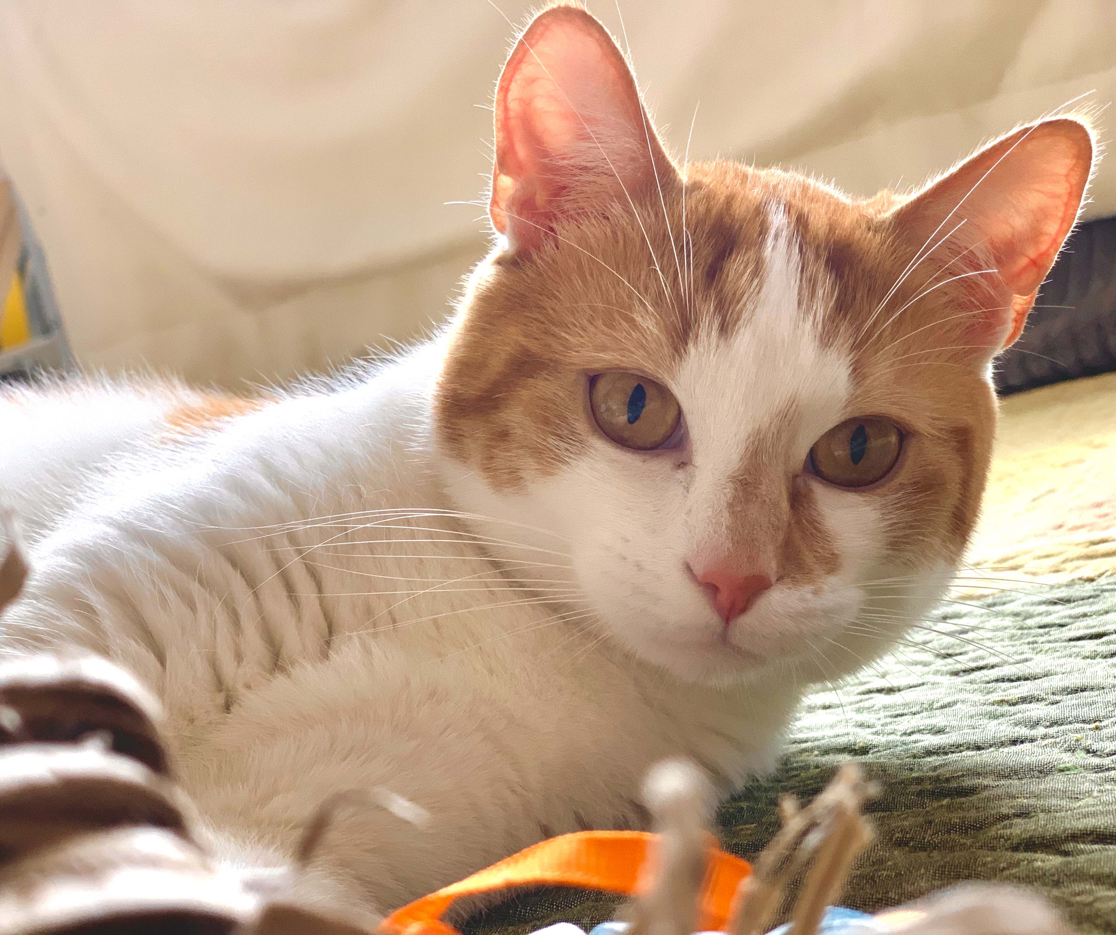 Caractéristiques physiques : chat roux et blanc avec de beaux yeux dorés, Testé négatif, identifié, vacciné et stérilisé.