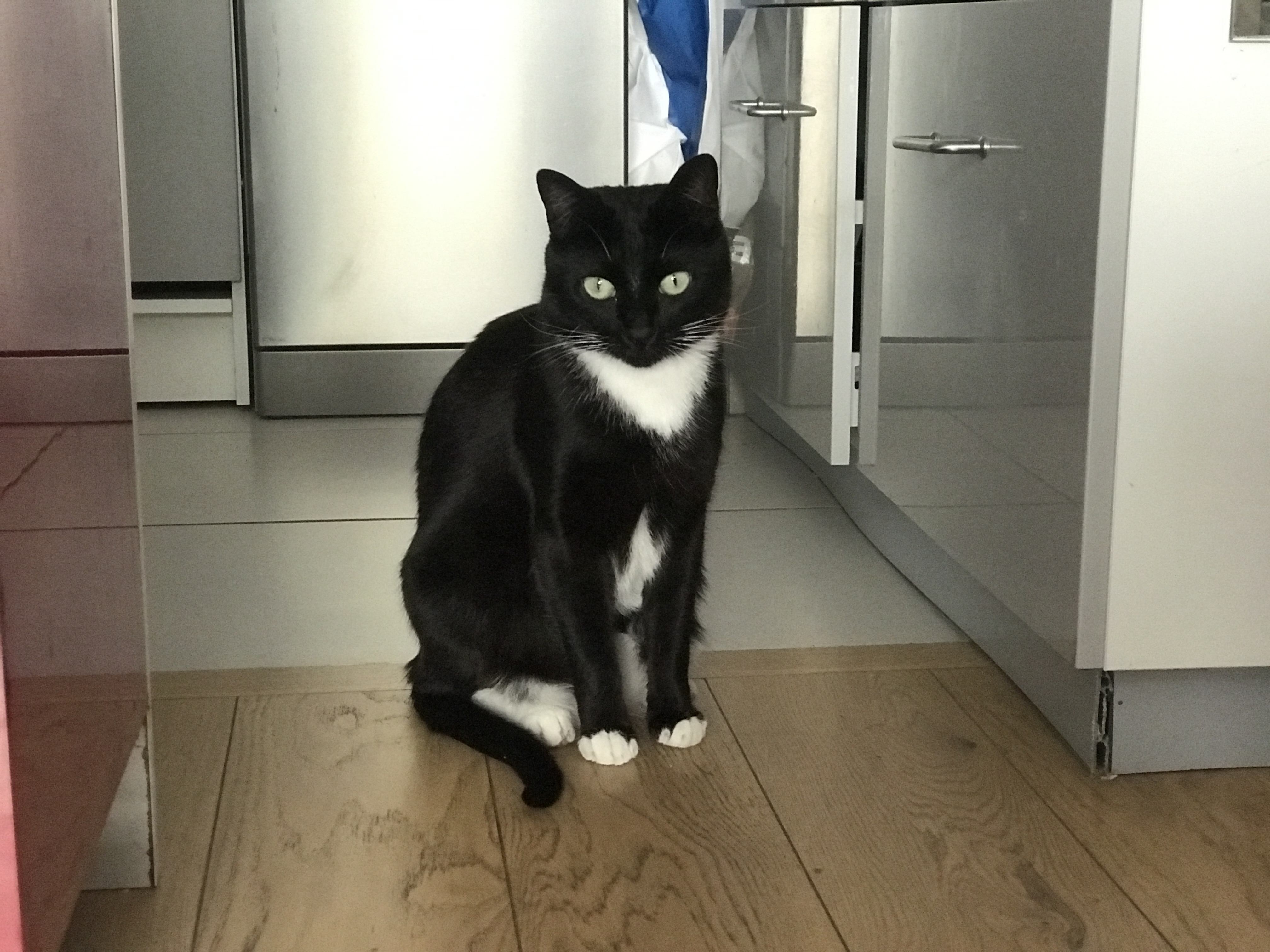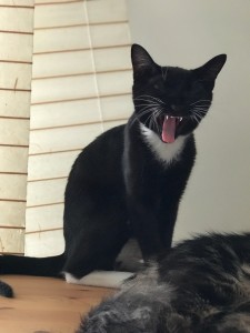 Caractéristiques physiques : joli pelage noir avec un plastron blanc et des chaussons blancs. Testé FeLV/FIV négatif, vacciné, stérilisé et identifié par une puce électronique.