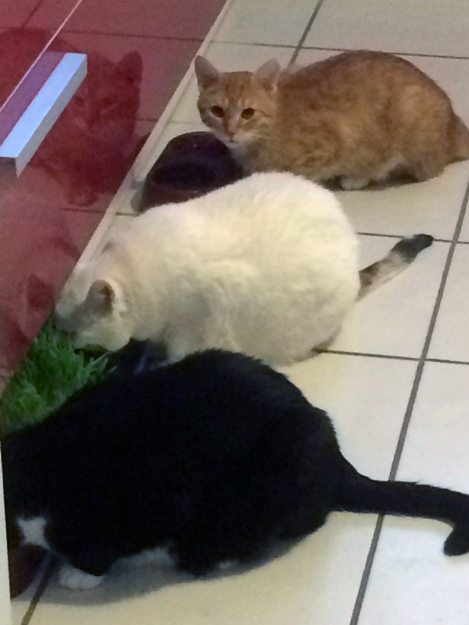 Voilà la photo de Roxy et ses frère et sœur adoptifs au petit déjeuner. C’était la première fois qu’il venait manger en même temps qu’eux, jusque là il attendait toujours qu’ils aient fini pour venir mais désormais c’est quotidien.