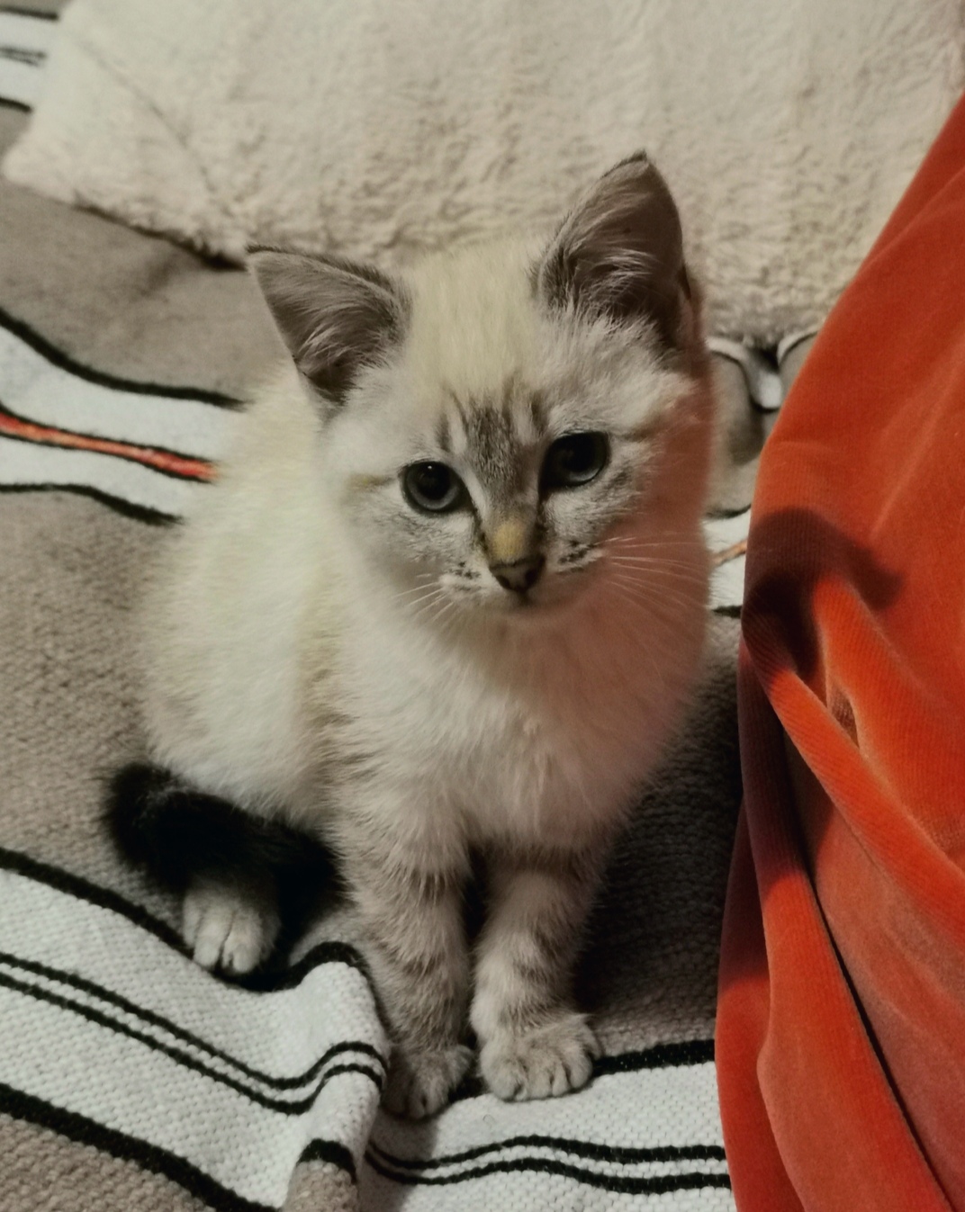 Caractéristiques physiques : magnifique pelage  Seal Point avec des yeux bleus. Testée FeLV/FIV négatif,  identifiée par une puce électronique. Vaccins en cours, sera stérilisée vers l’âge de 6/7 mois par l’association.