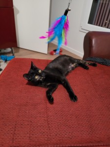 Emma, plutôt timide au départ avec les inconnus, une fois mise en confiance, elle adore les câlins et vient les demander en donnant de petits coups de tête. Très intelligente, elle a déjà ouvert un tiroir de la cuisine pour récupérer son jouet favori. Eh oui, Emma adore la canne à pêche à plumes qui grelotte et si on prend un peu de temps pour jouer avec elle, elle deviendra très vite votre plus grande fan ! Elle adore jouer, mais au quotidien reste très douce et calme (elle ne mord et ne griffe jamais) elle a un poil très doux ! Elle miaule peu et discrètement. C’est un petit ange.