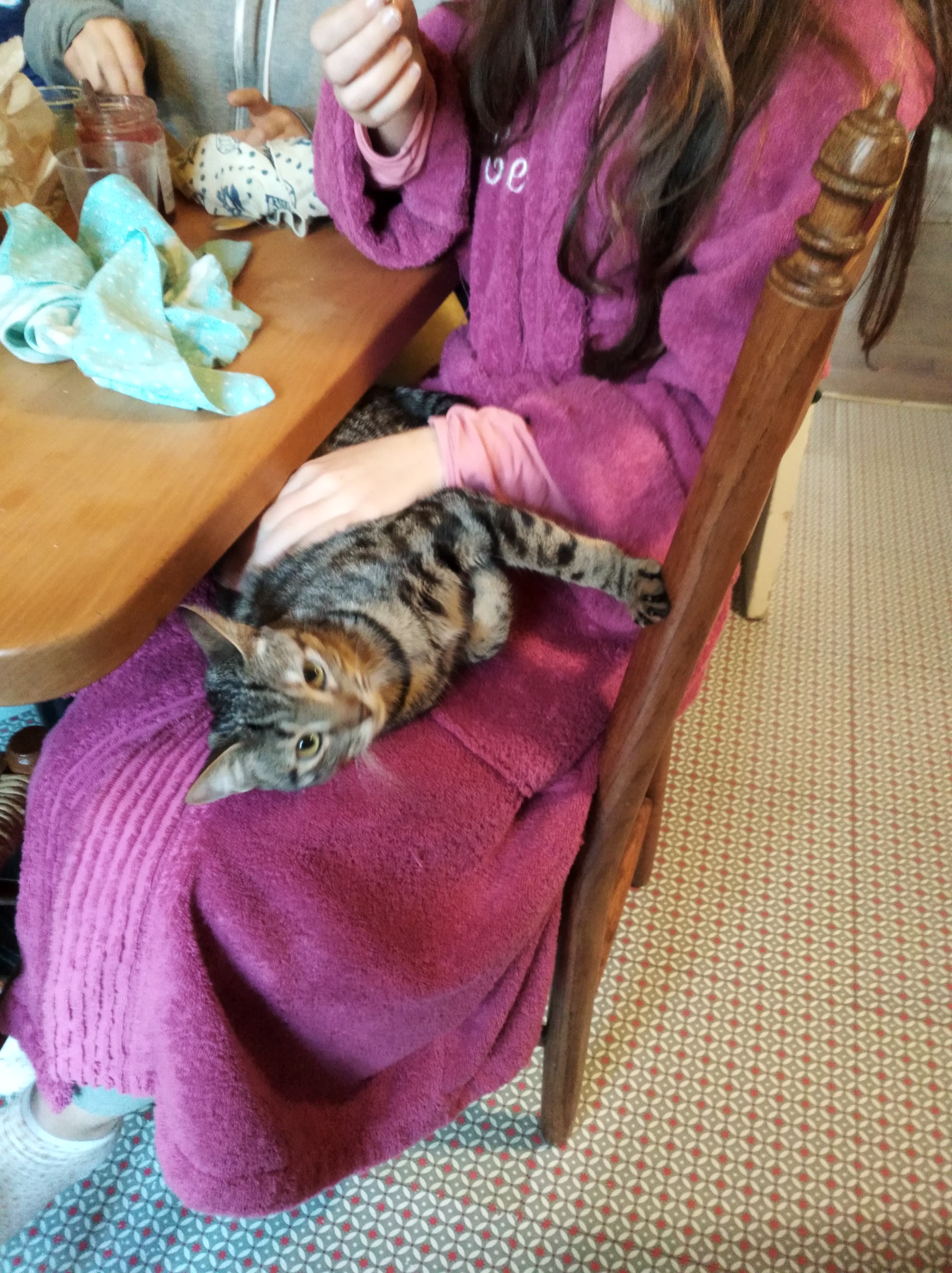Caractère : Gaufrette peut être un peu timide quand elle ne connait pas, se cacher même, mais une fois en confiance elle est très demandeuse d’affection et de câlins. Elle se permet d’aller de genoux en genoux quand on est installé ! Un peu acrobate, elle grimpe haut, la tringle du rideau de douche lui plait bien..., elle court vite. Elle apprécie les câlins et ronronne si fort à ces moments là ! Elle est gentille et en bonne santé ; petite chatte très attachante.