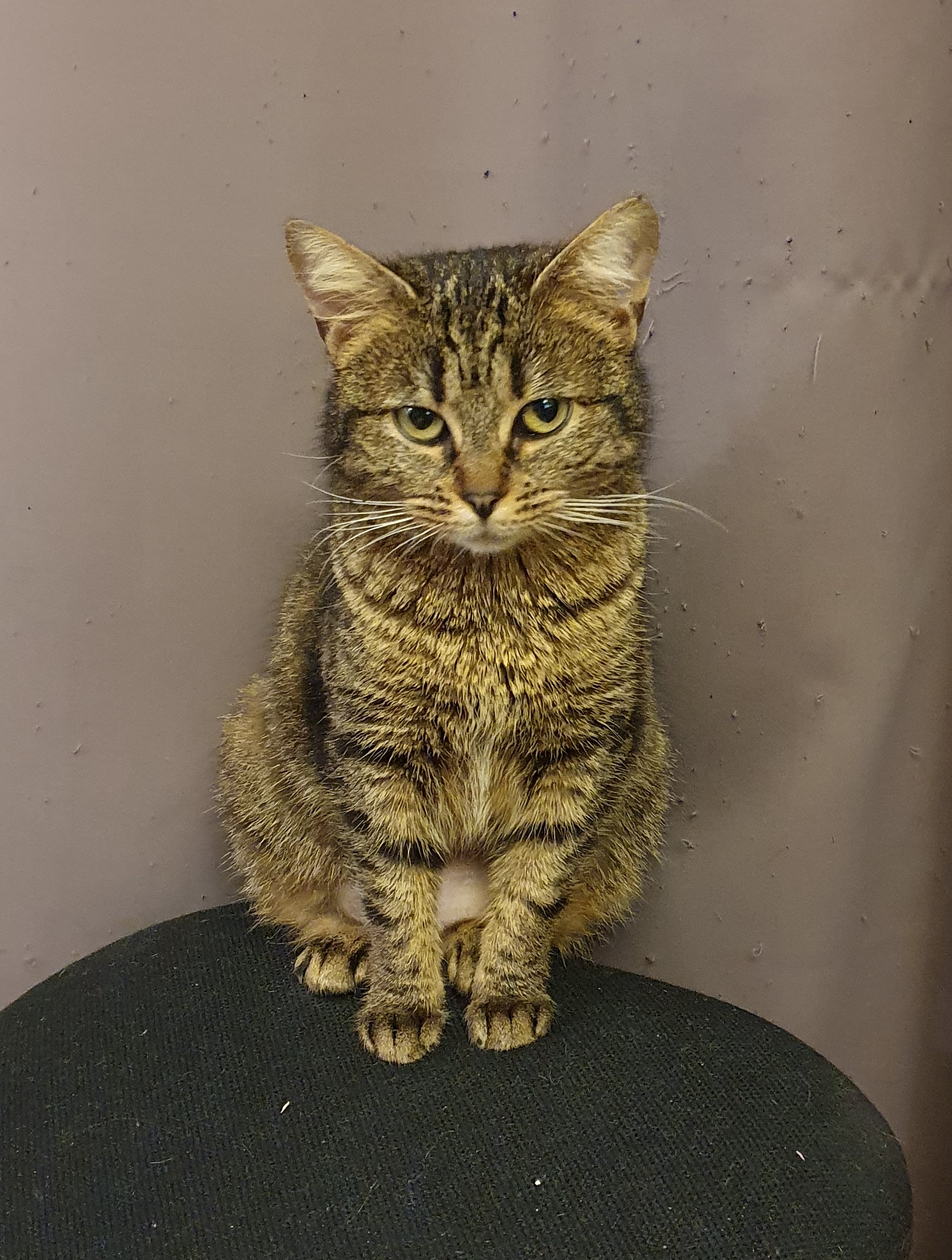 Caractéristiques physiques :  pelage tigré, yeux verts, de petite taille. Testée FeLV/FIV négatif, vaccinée, stérilisée et identifiée par une puce électronique.