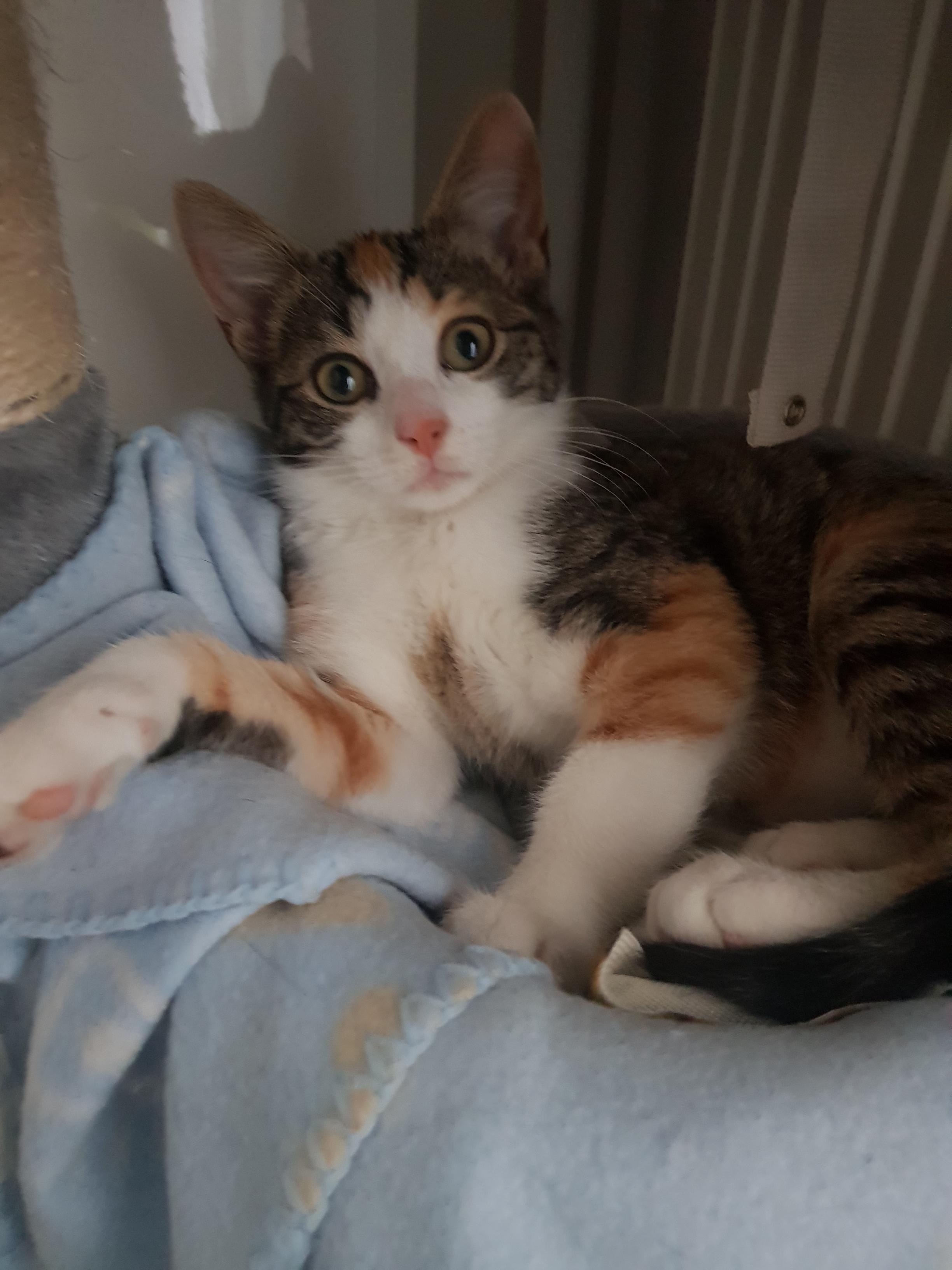 Caractéristiques physiques : très beau pelage tricolore. Test FeLV/FIV négatif, vaccinée et identifiée par une puce électronique. Sera stérilisée vers l’âge de 6 mois par l’association.