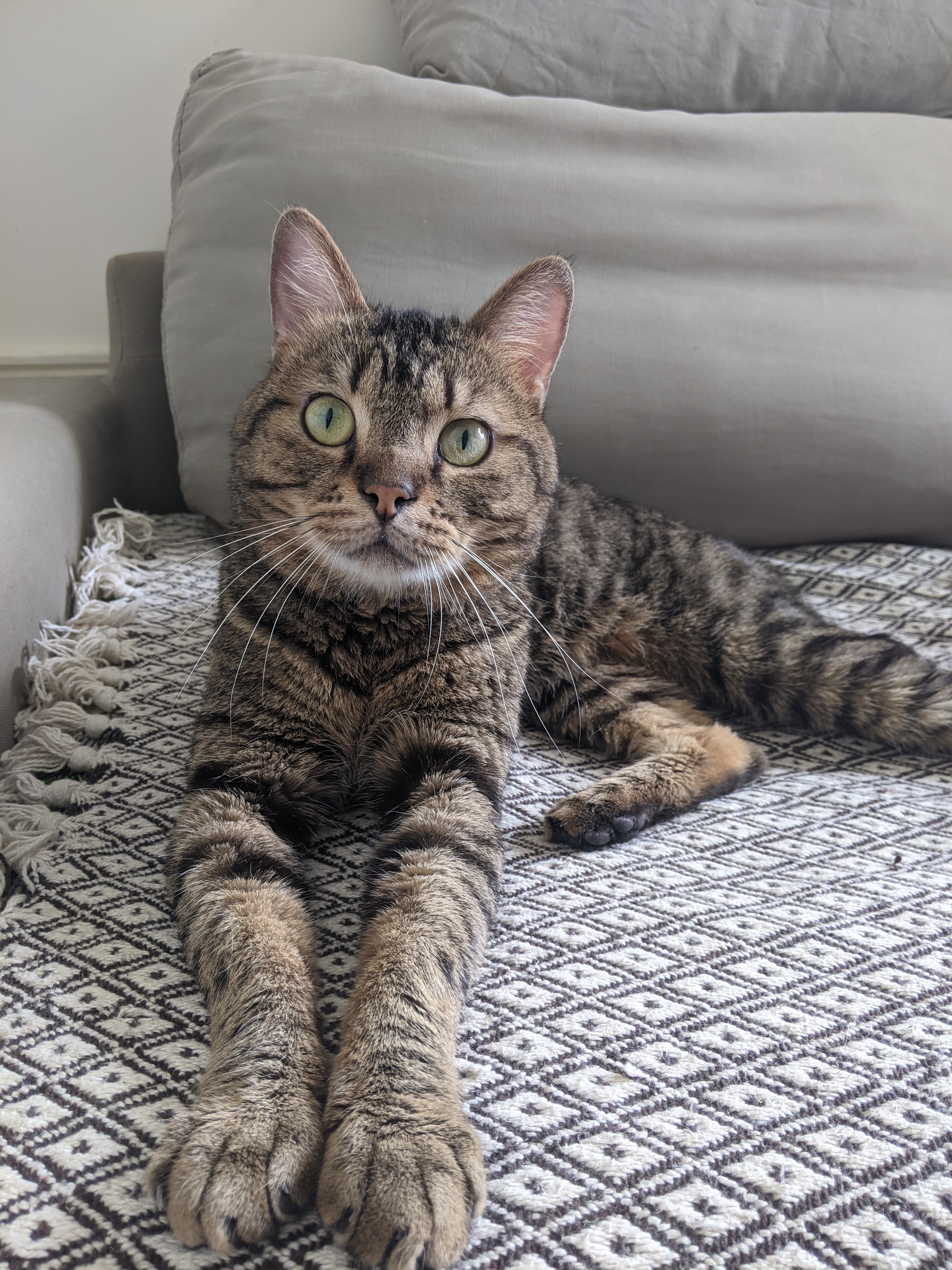 Caractéristiques physiques : beau pelage tigré, yeux verts. Testé FeLV/FIV négatif, vacciné, castré et identifié par une puce électronique.