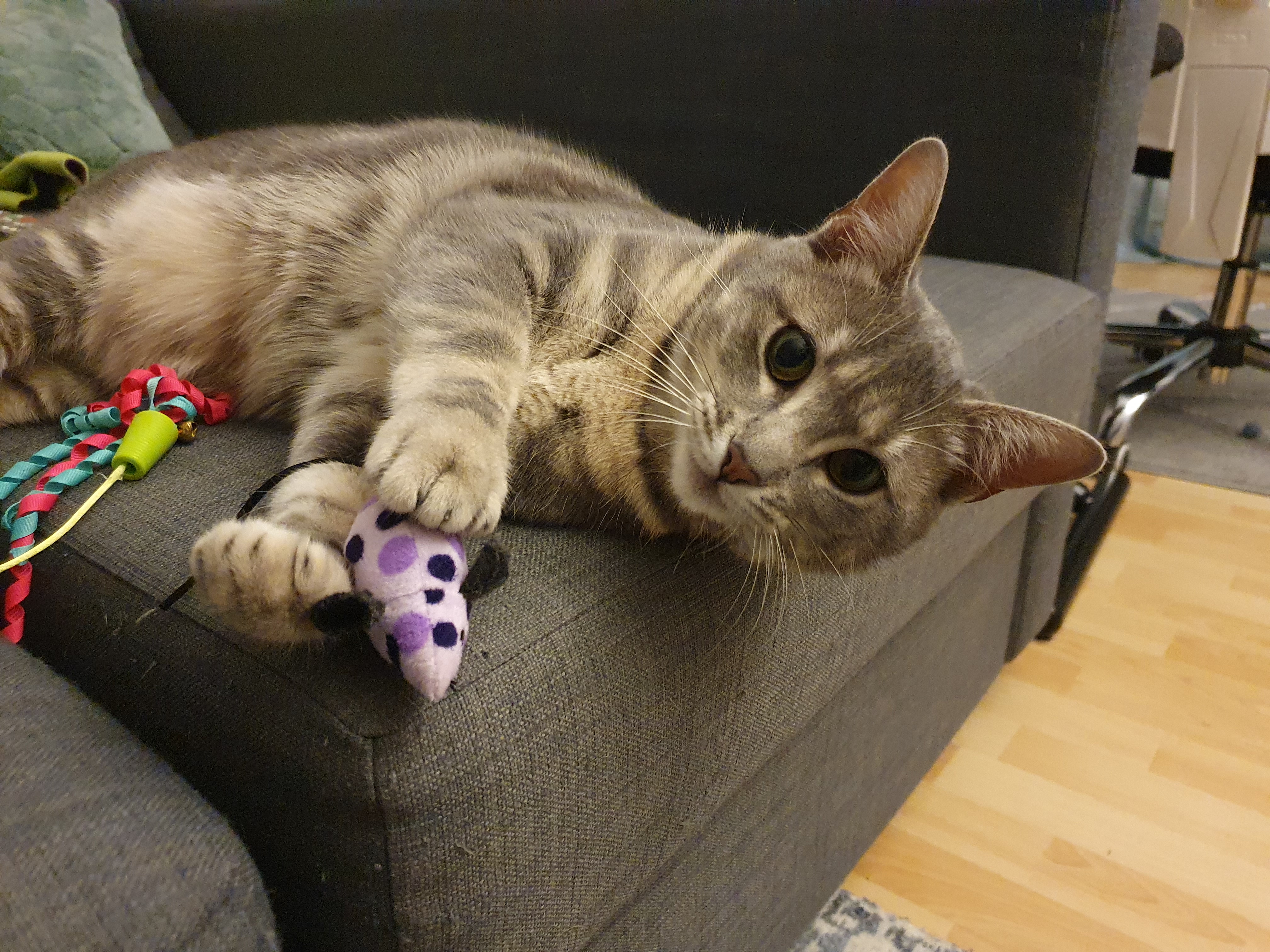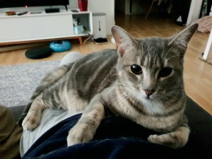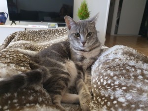 Caractère : Cinthia est une chatte très calme et très sociable. Elle adore la compagnie de sa famille d’accueil et se repose toujours près d’eux. Elle apprécie l’étage intermédiaire de l’arbre à chat pour observer son environnement et faire la sieste. A chaque retour à la maison elle réserve un accueil chaleureux à sa famille d’accueil avec petits miaulements et câlins. Elle adore les caresses et accepte toujours d’être portée. Elle est très gourmande, mais elle sait attendre tranquillement l’heure de la pâtée. Quand l’envie lui prend elle adore jouer jusqu’à ce que les jouets disparaissent sous le canapé ou derrière l’armoire.