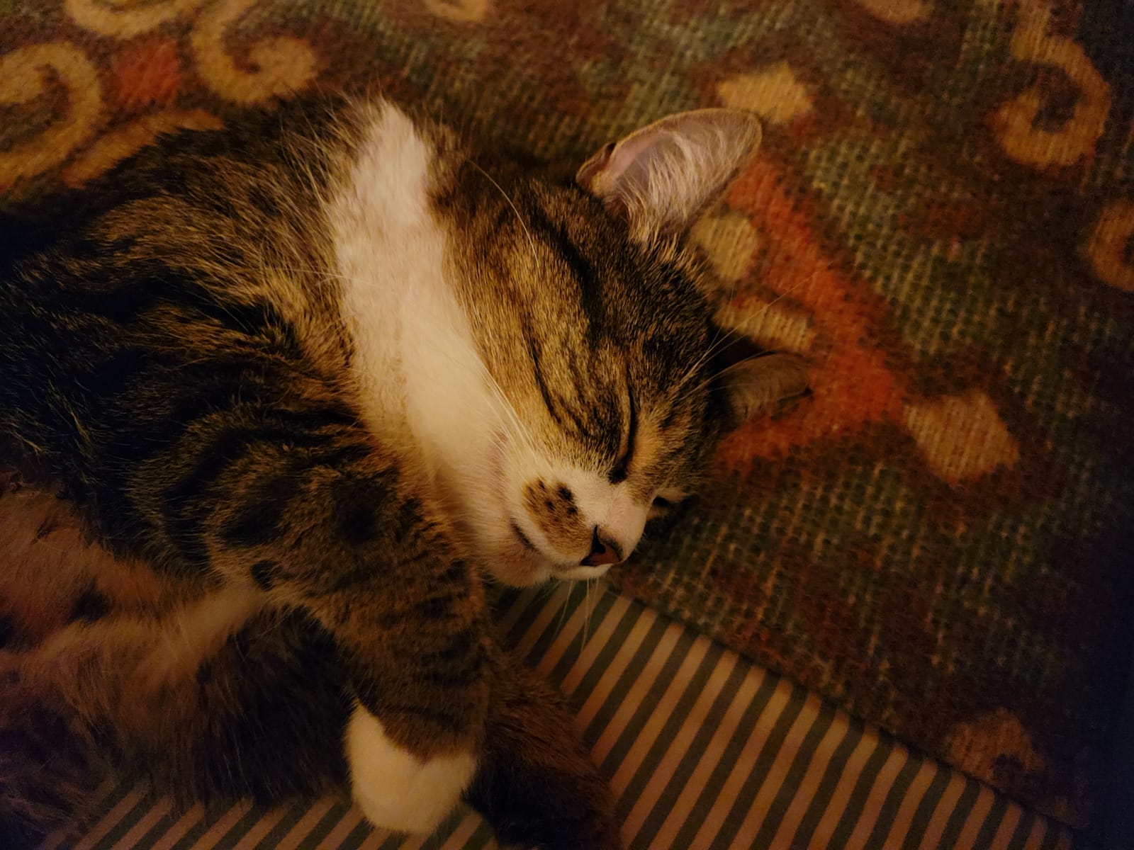 Caractéristiques physiques : jolie robe tigrée et blanche. Testée FeLV/FIV négatif, vaccinée, stérilisée et identifiée par une puce électronique.