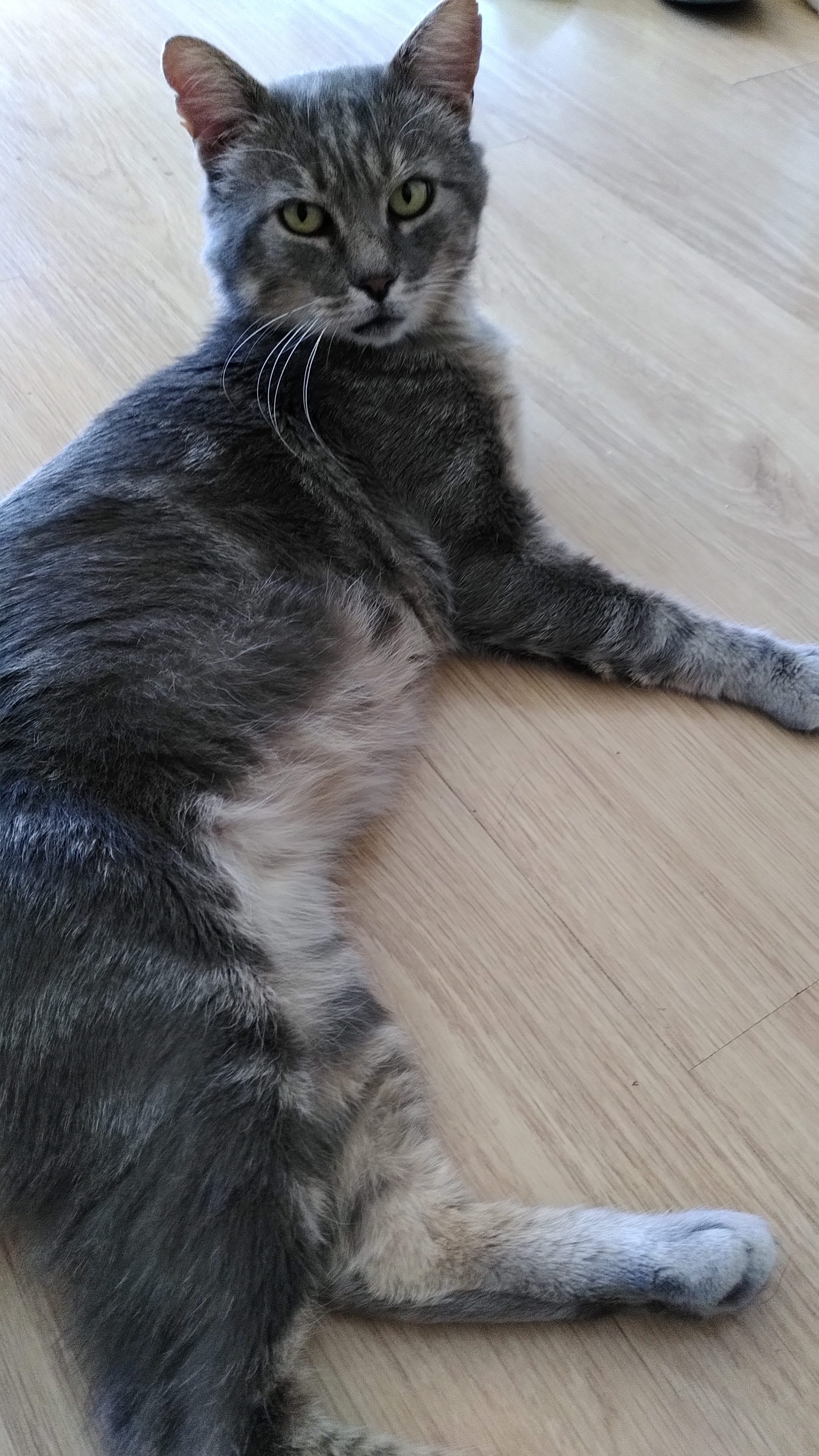 Caractéristiques physiques : Joli chat assez grand. De beaux yeux verts/jaunes avec un pelage tigré gris sur le dos et blanc sur le ventre. Zone de pelade sur le cou suite à une allergie, la repousse des poils reprend doucement ! Vacciné, castré, FIV/Felv négatif, et identifié par puce électronique.