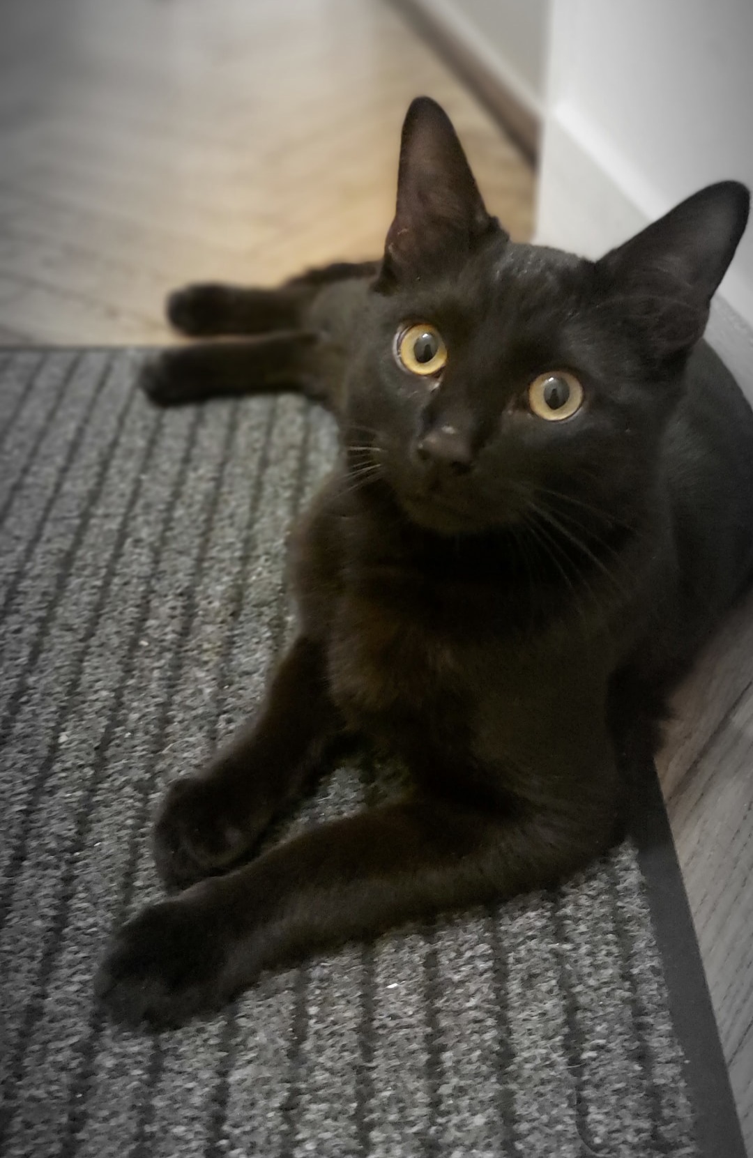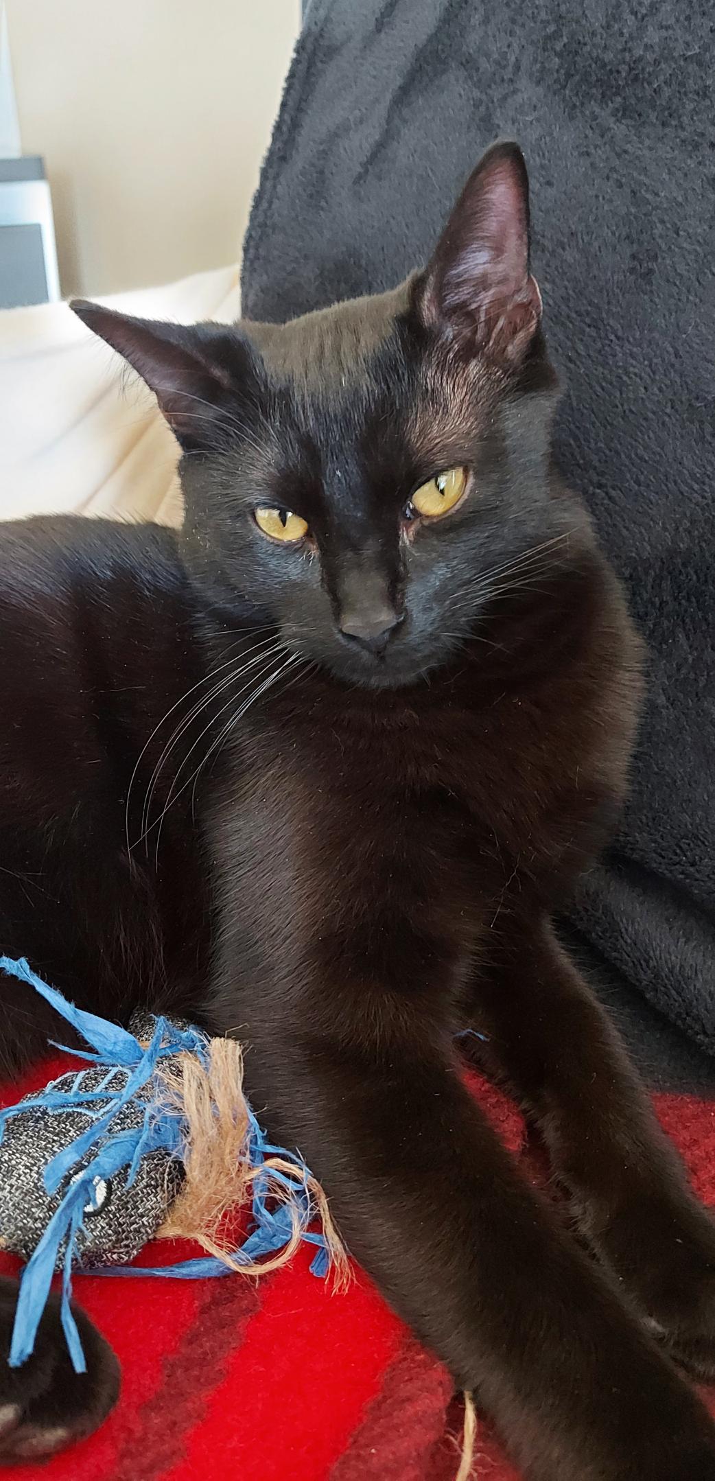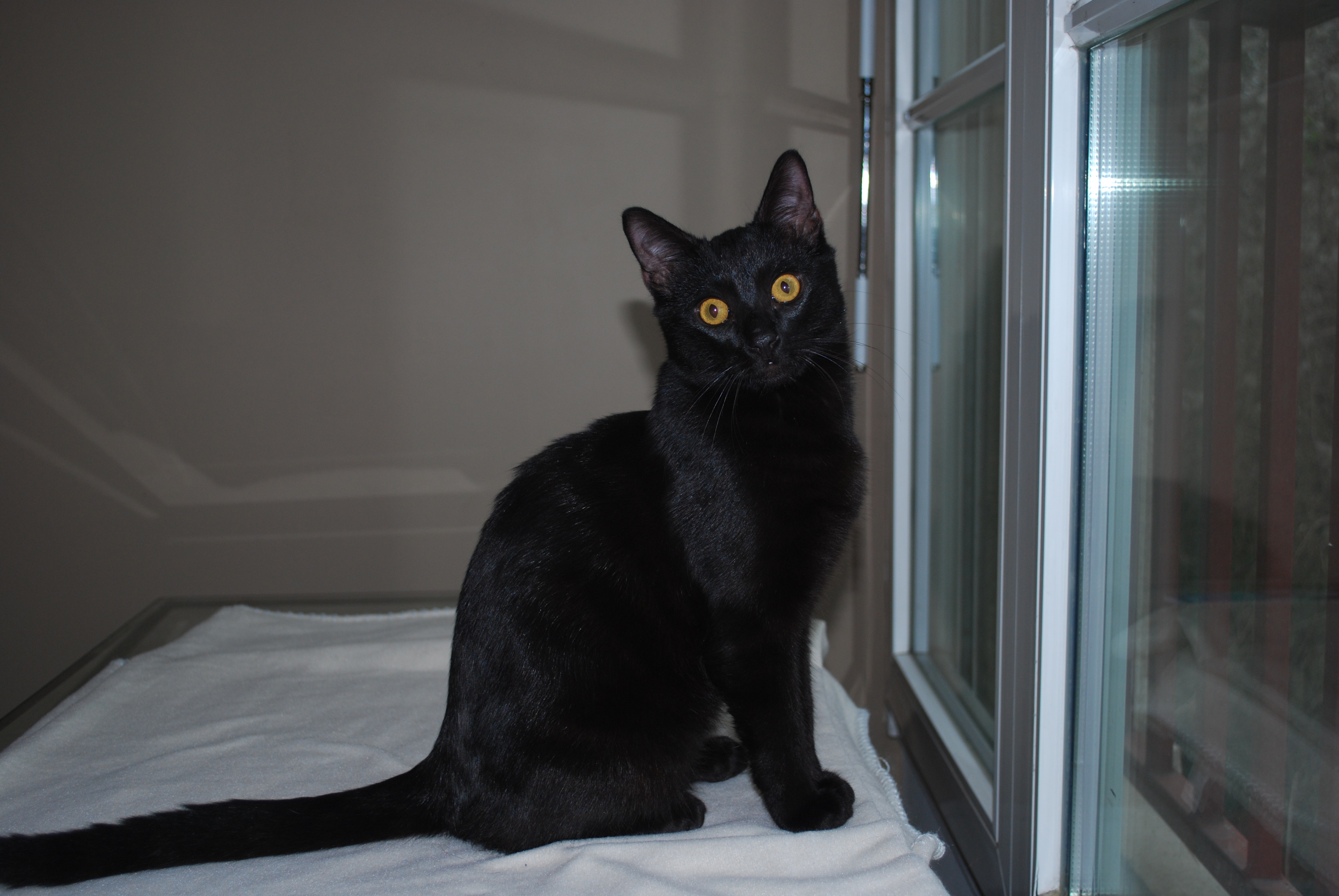 Caractéristiques physiques : pelage noir avec des yeux oranges. Testé négatif FeLV/FIV, stérilisé, vacciné et identifié par une puce électronique.