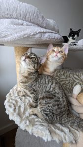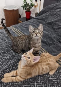 Caractère : tous deux gentils et câlins, bien dans leurs pattes, ils s’adaptent vite à leur nouvel environnement : pas peureux du tout et même avec les inconnus. Très joueurs, ils s’amusent avec un rien pendant des heures.