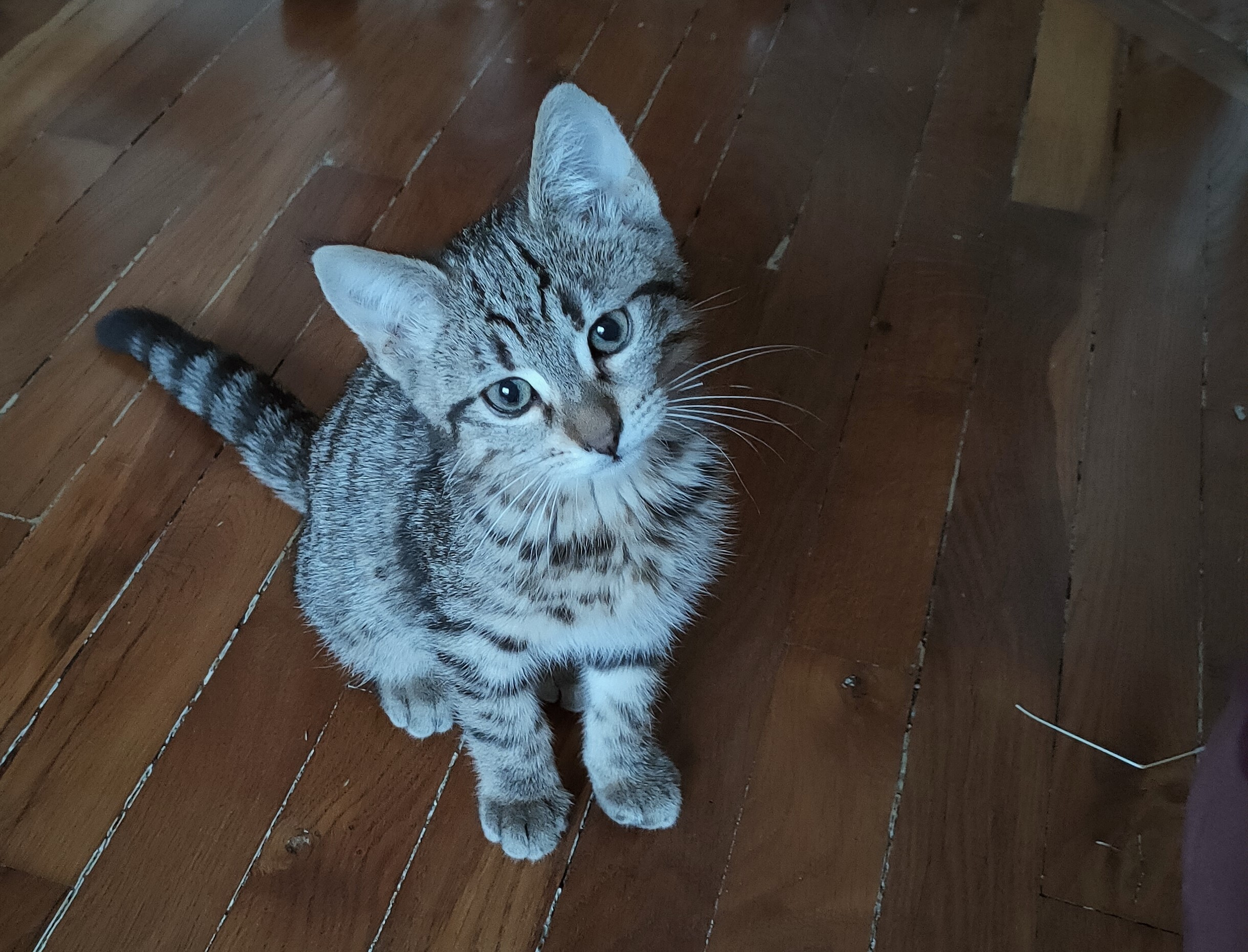 Caractère : Pollux est un chaton très sociable, curieux et plein d’énergie. Il se sent tout de suite à l’aise dans un nouvel environnement. Il ronronne dès qu’il s’approche de vous et se laisse facilement porter dans les bras. Il réclamera sans modération des câlins, des caresses et surtout de la nourriture (il est très gourmand !).