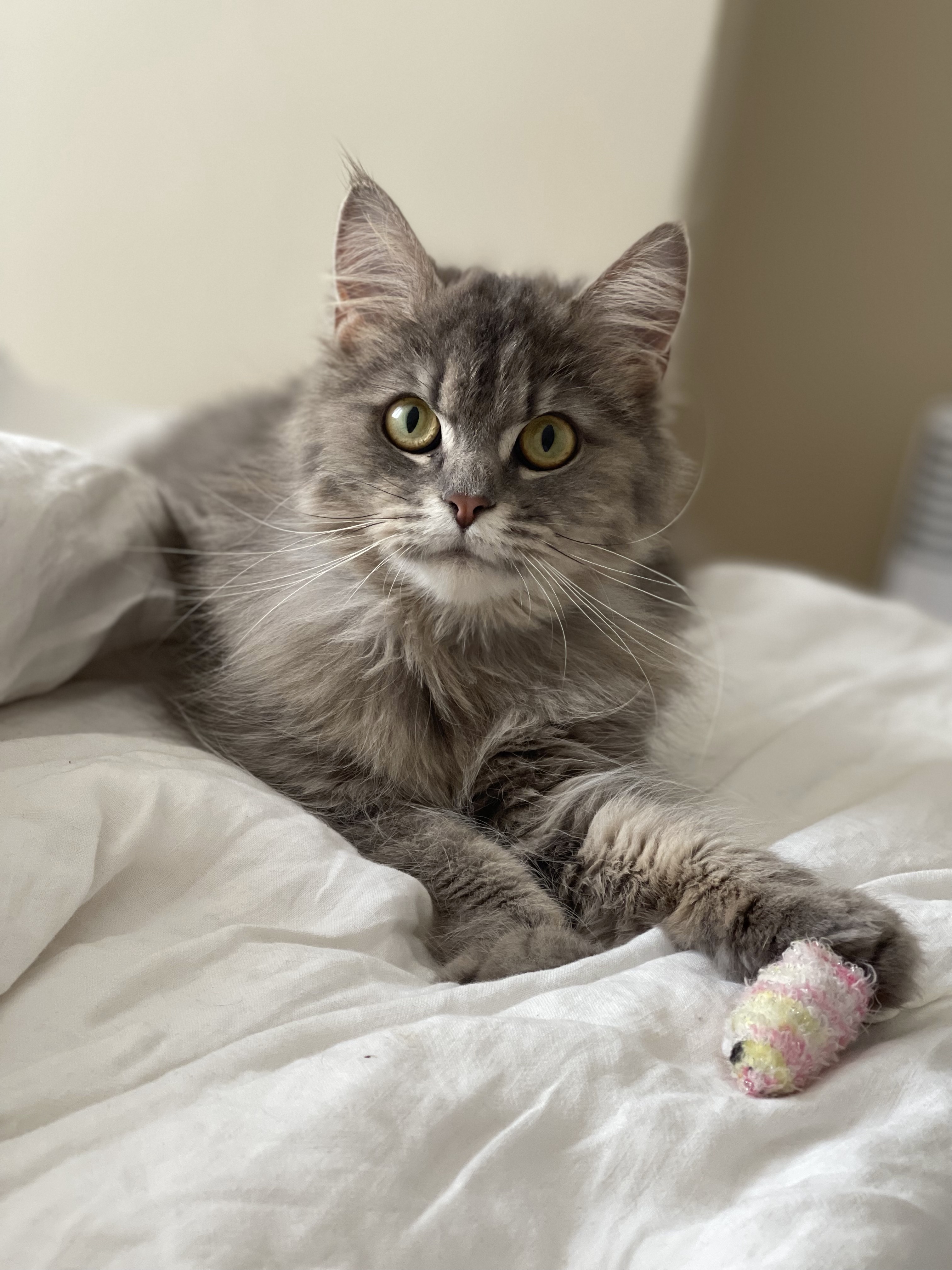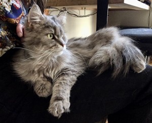 Caractéristiques physiques : belle robe grise, poils longs. Testée FeLV/FIV négatif, stérilisée, vaccinée et identifiée par une puce électronique.