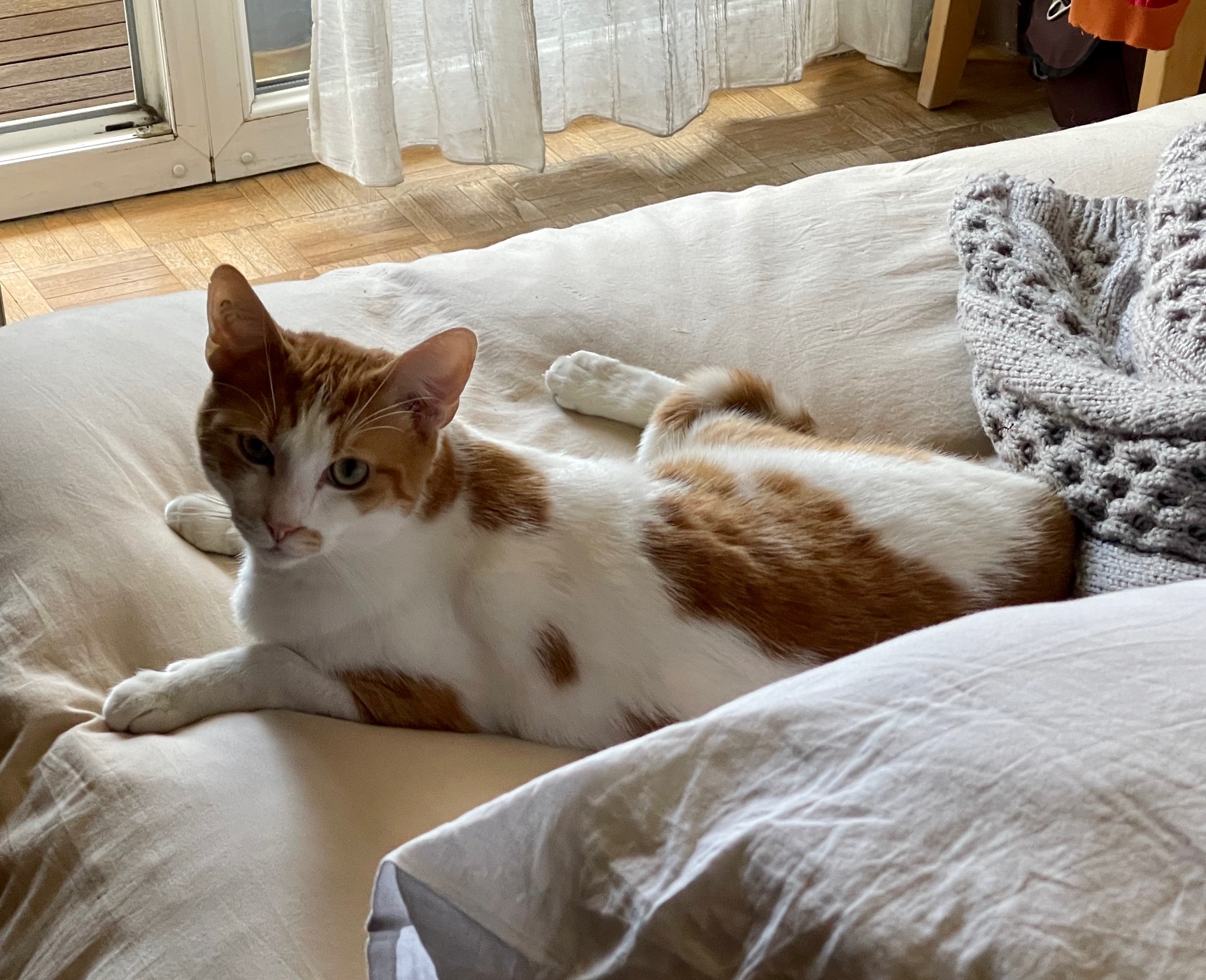 Caractéristiques physiques : Chat au pelage roux et blanc. Testé négatif Fiv/FeLV, il est vacciné et stérilisé.