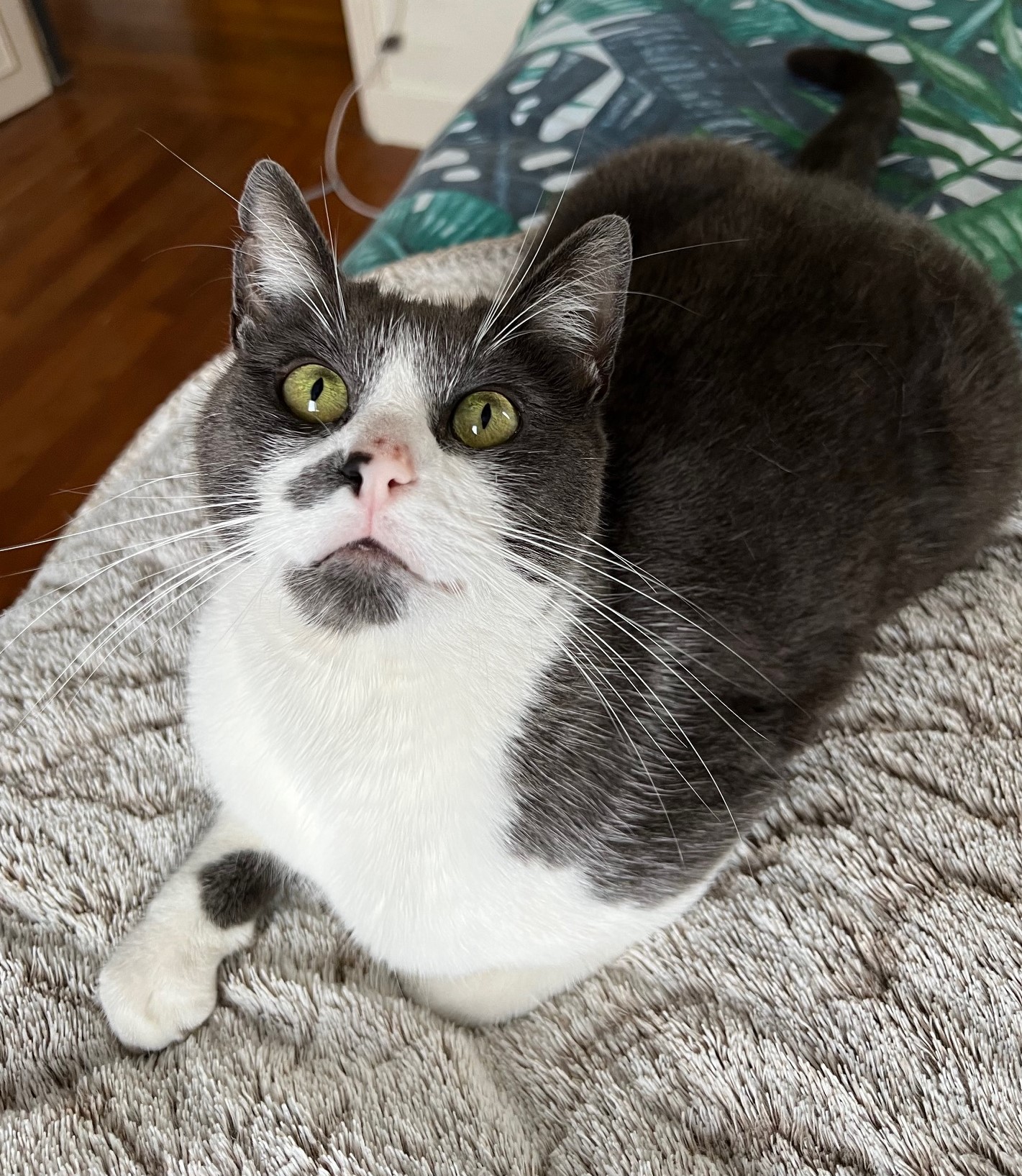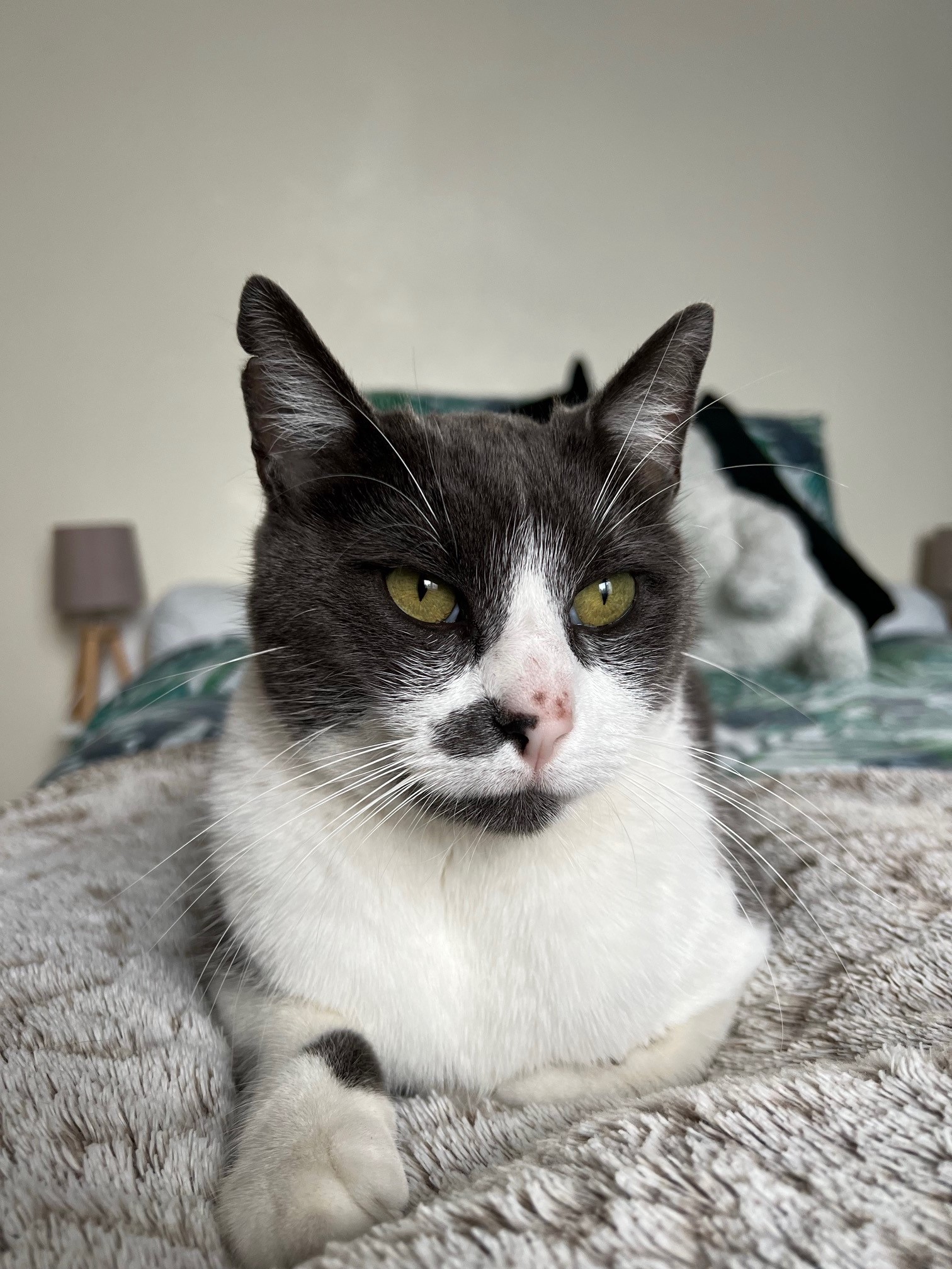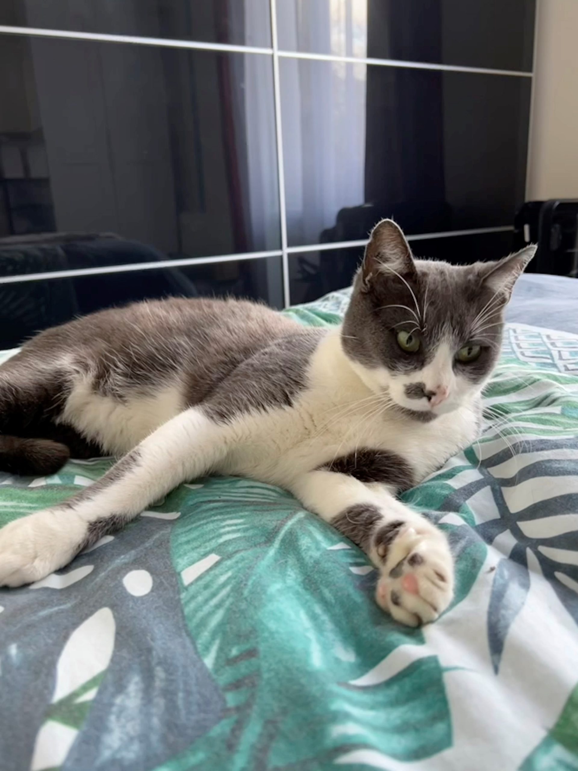 Caractéristiques physiques : beau chat gris et blanc.