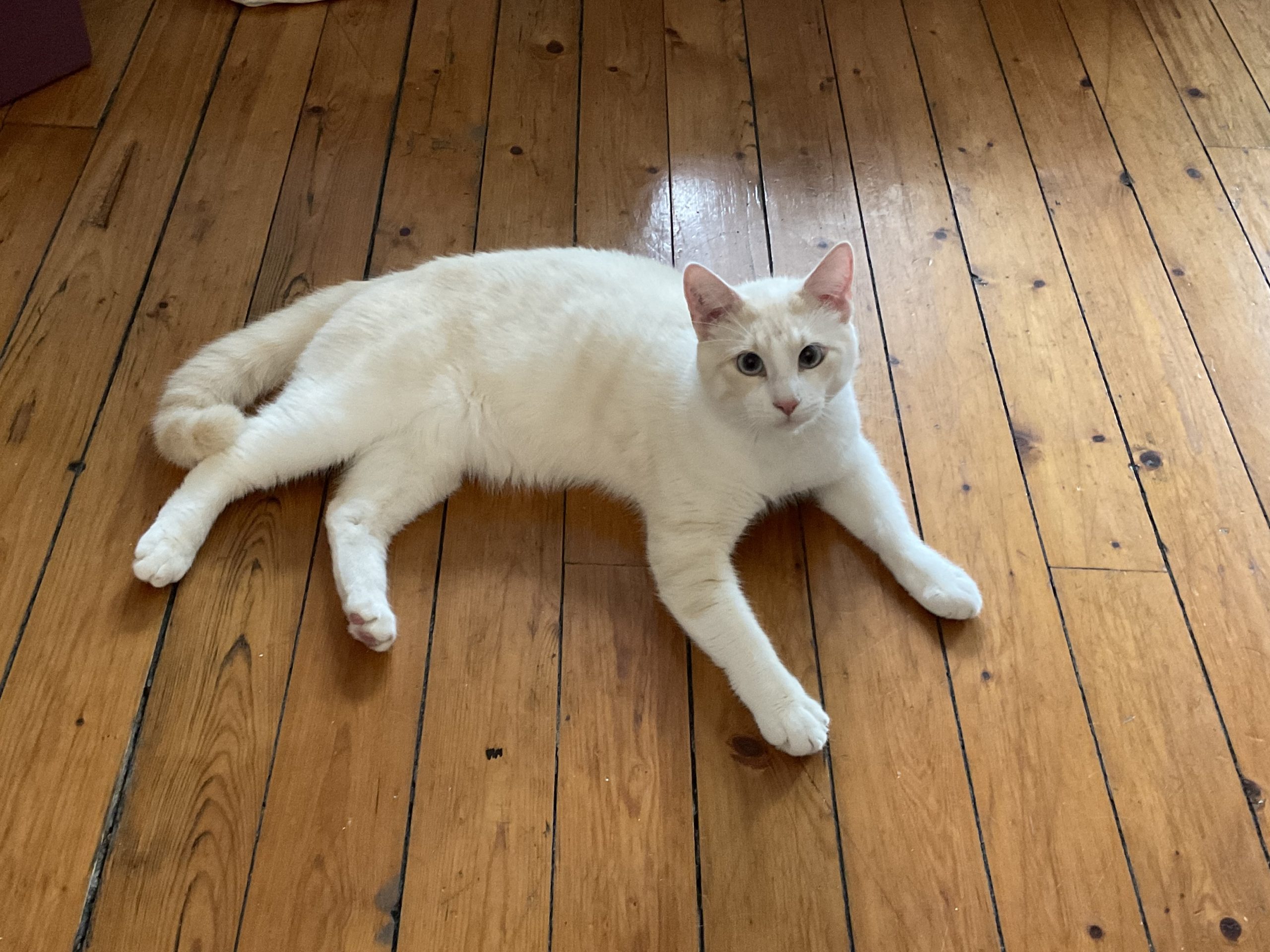 Caractéristiques physiques : pelage crème, yeux verts, testé FIV et FeLV négatif, vaccins à jour, castré, identifié par tatouage.