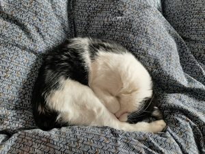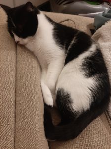 Caractère : Maki est l’aînée d’une portée. C’est sûrement pour cela que c’est la plus courageuse. Elle n’a pas peur de l’aspirateur ou de la douche et essaie toujours d’explorer en dehors quand on ouvre la porte. Son beau pelage noir et blanc, ainsi que ses grands yeux ébahis sauront avoir raison de vous. Elle aime rester en notre compagnie et ne dit pas non a quelques caresses même s’il est encore un peu compliqué de la prendre dans les bras sans qu’elle veuille s’échapper. Elle aime jouer avec tout ce qui roule ou glisse a travers la maison et faire la sieste auprès d’un congénère.