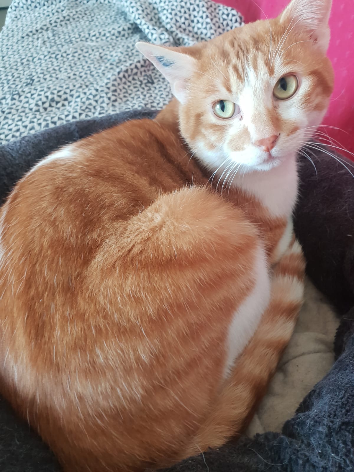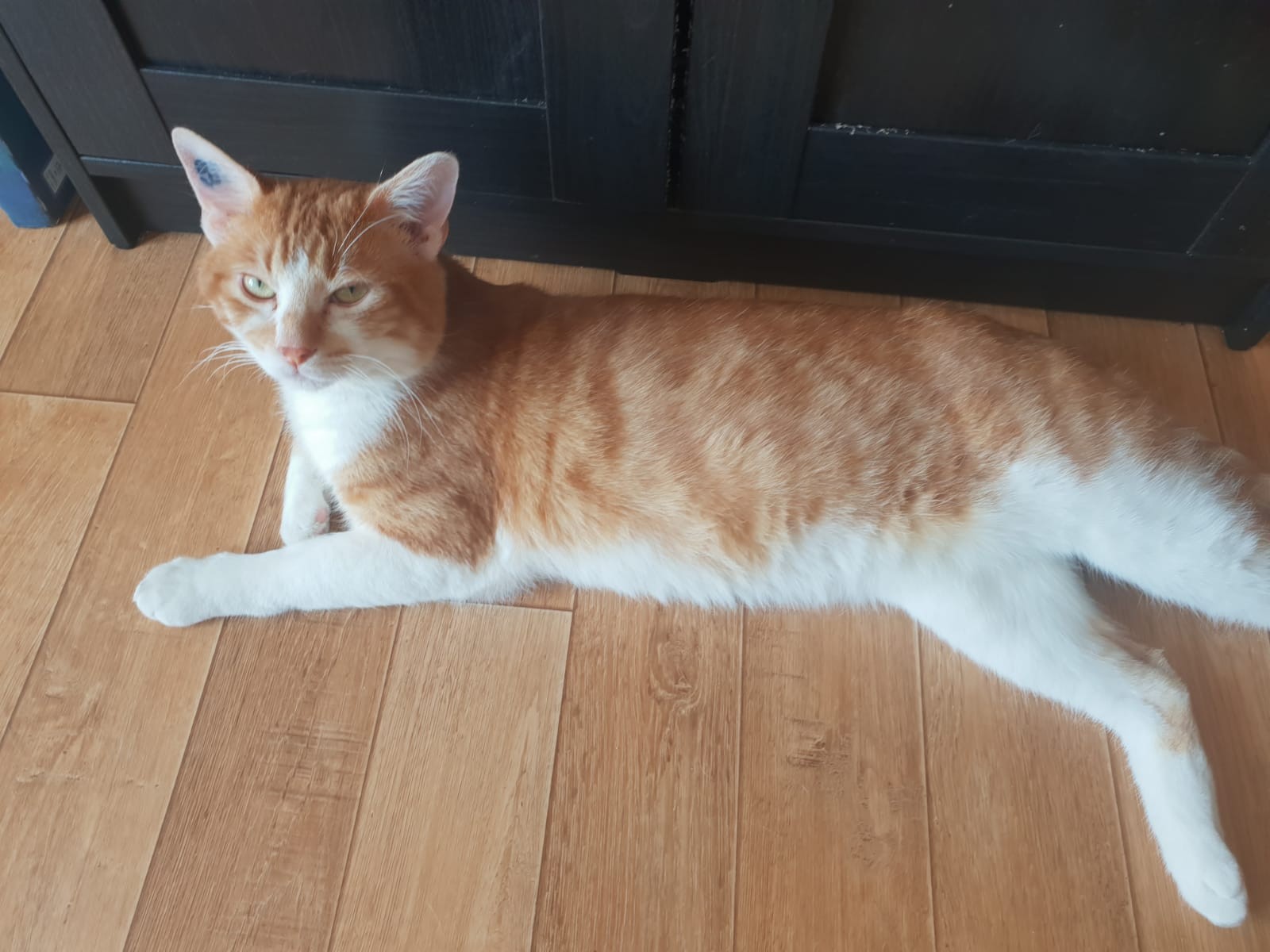 Caractéristiques physiques : jeune chat roux et blanc, plutôt grand, castré, testé FIV et FeLV négatif, identifié par tatouage, vaccins à jour.