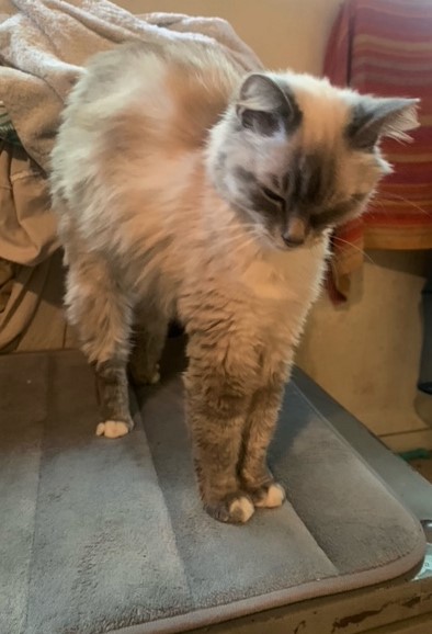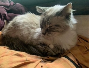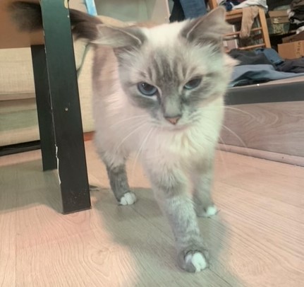 Caractéristiques physiques : très belle minette type siamoise aux poils mi-longs et de beaux yeux bleus.