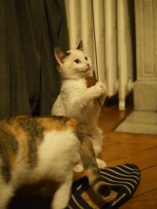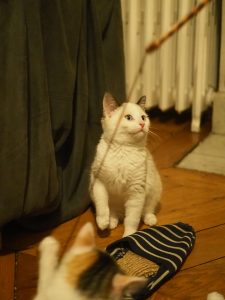 Elle s’est adoucie depuis son arrivée en prenant exemple sur ses sœurs (exploration de l’appartement, moments de jeu, temps calmes avec des caresses…). Dans les moments de réveil, elle adore jouer à pourchasser ses sœurs et joue de plus en plus avec sa famille d’accueil quand on lui tend une canne à pêche.