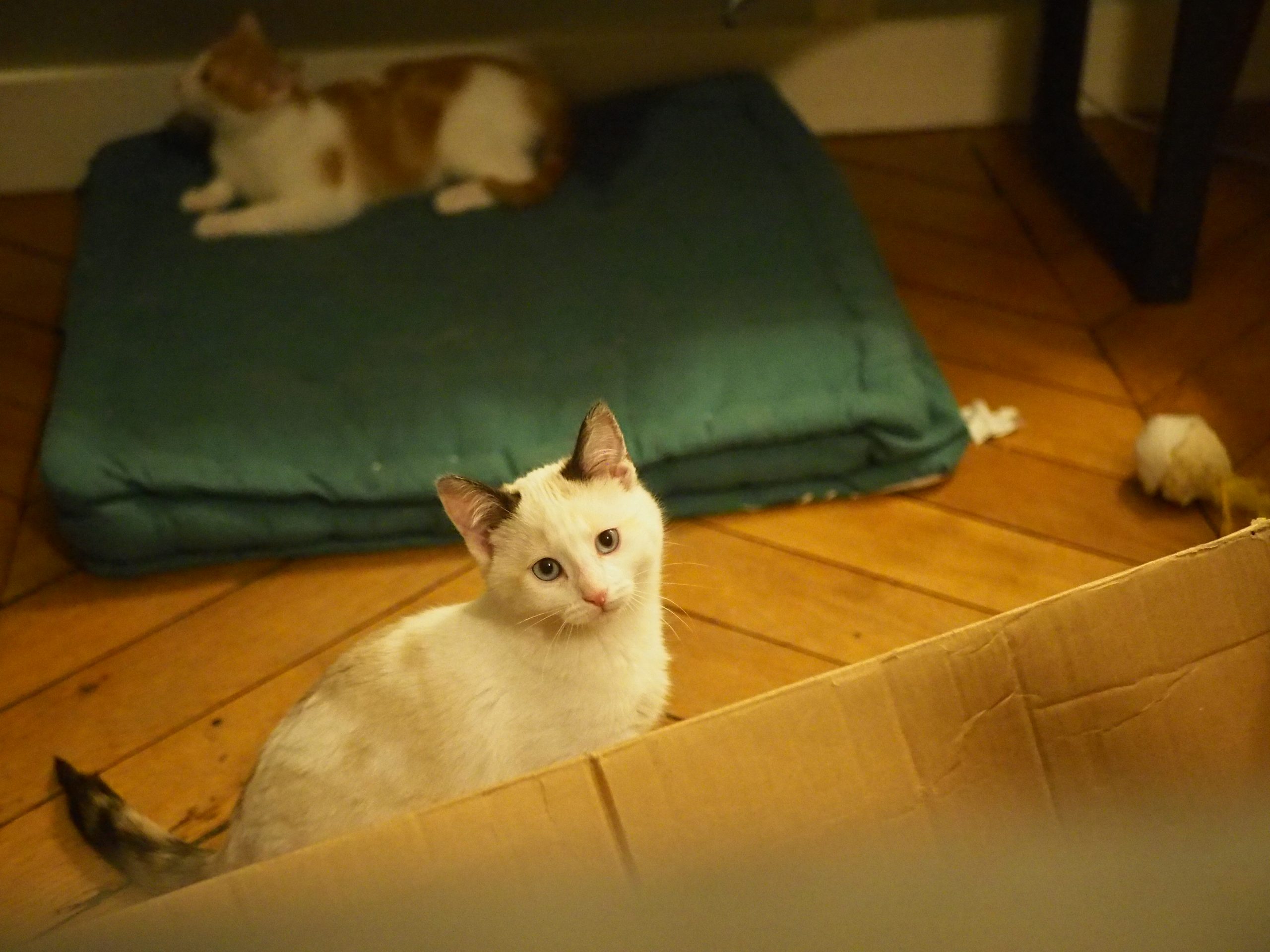 Histoire : La maman de Biboune, Boogie et Bianca les a fait naître dans un entrepôt. Choyées par les salariés de l’entrepôt, ils ont été mis à l’abri par une protectrice avec laquelle nous collaborons.