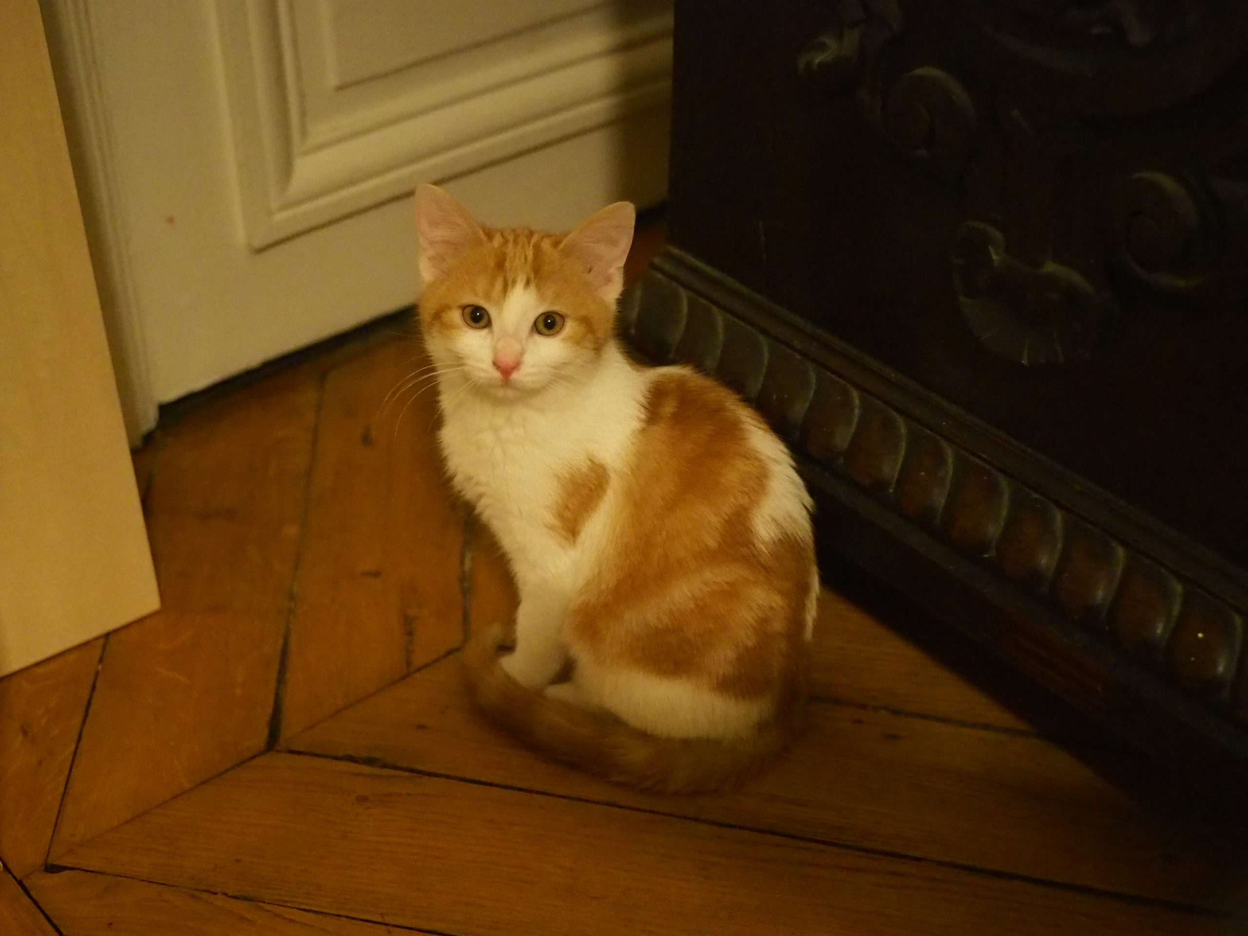 Caractéristiques physiques : Petite femelle rousse et blanche. Testée FeLV et FIV négatif, vaccinée, identifiée par une puce électronique, sera stérilisée à l’âge de 6 mois.