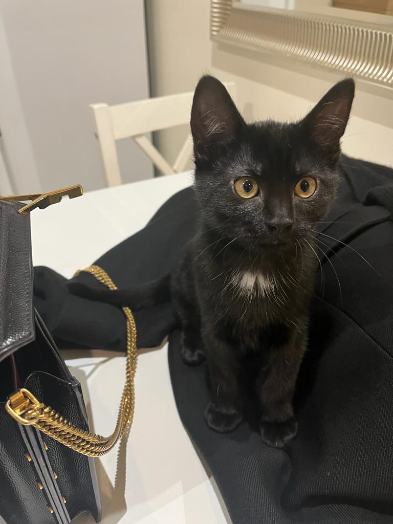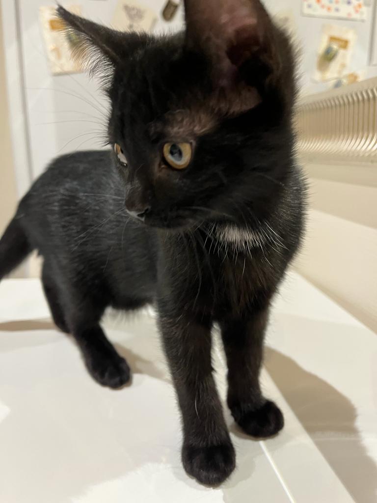 Caractéristiques physiques : belle chatonne au pelage noir avec une tache blanche sous le cou.