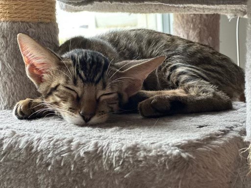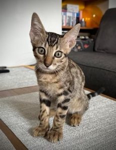 Il est joueur, mais pas destructeur : s’il prend un objet qu’il n’est pas censé prendre (comme un câble), il suffit de le lui retirer et de lui donner un jouet, et il continuera à jouer comme si de rien n’était. S’il a besoin d’attention pour quelque raison que ce soit, il viendra vers vous et fera un long miaaaaaaaaaaaou. Il vous suffit de le prendre dans vos bras, de lui dire que vous l’aimez et de le placer près de vous (sur vos genoux, sur une table où vous travaillez, sur une chaise à côté de vous – n’importe quel endroit où il a le droit de s’asseoir et de se sentir proche de vous).