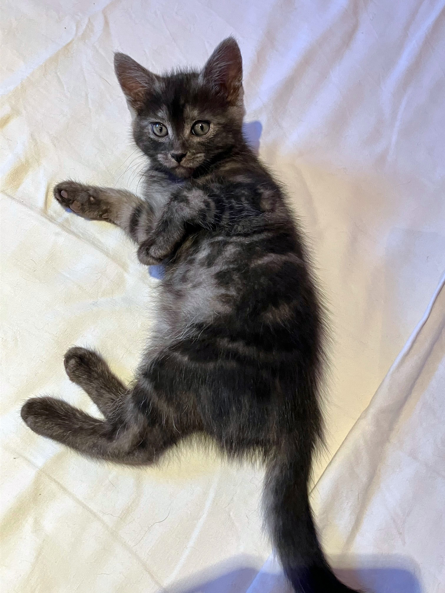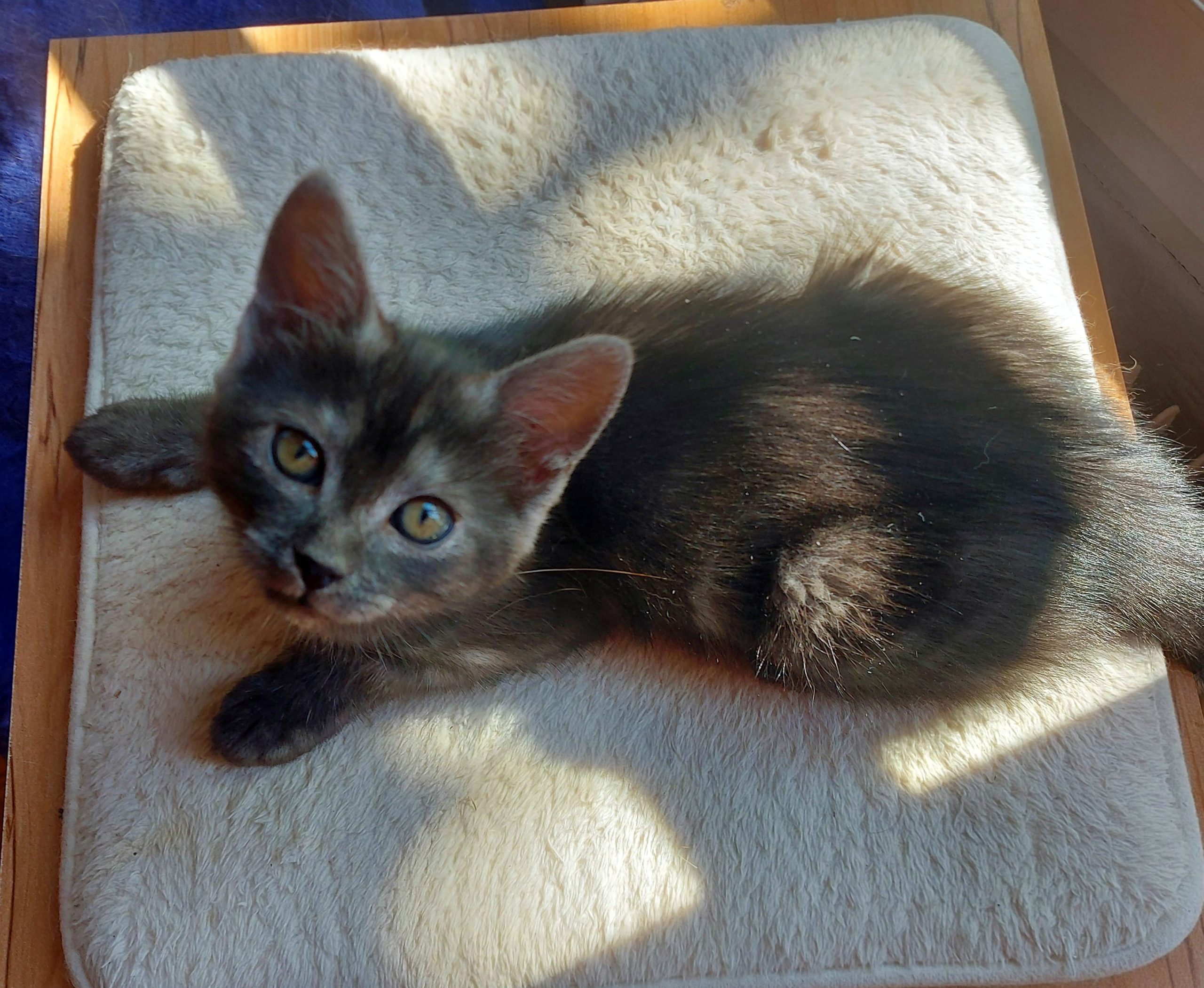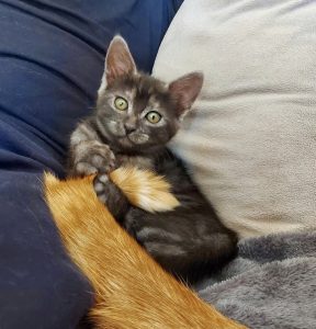 Caractère : Molly est une adorable chatonne, fine et très proche de l’humain. Elle adore les après-midi couchée sur les genoux à dormir. Mais il ne faut pas s’y fier, Molly a énormément d’énergie. Elle aime courir, grimper partout et sauter après sa canne à pêche. C’est aussi une grande aventurière qui aime explorer toutes les cachettes, les sacs, la baignoire et chaque recoin de la bibliothèque. Elle déteste les portes fermées, et n’hésite pas à vocaliser pour qu’on lui ouvre. Elle aime aussi beaucoup grimper sur les épaules, et s’y installe parfois pour observer ce que l’on fait. Parfois, elle s’endort même dans la capuche de nos pulls ! En bref, Molly est une tornade pleine d’amour qui n’attend plus que de rencontrer sa nouvelle famille et ses nouveaux copains pour la vie.
