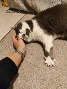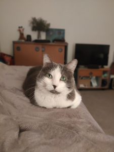 Caractère : Ralph est un pépère de 12 ans qui appréciera un environnement calme et chaleureux. Bien qu’il puisse paraître un poil peureux en arrivant dans sa nouvelle maison, il saura vite s’acclimater à ce qui l’entoure et saura prendre confiance lorsqu’on l’appelle avec douceur. C’est un chat vraiment très gentil et affectueux, qui adore se faire gratouiller sous le cou et sur le dessus de la tête, mais également en bas du dos. Il saura faire comprendre qu’il demande des câlins en s’approchant, miaulant, et en se roulant par terre lorsqu’il obtient notre attention ! On craque très facilement lorsque l’on croise le regard de ses beaux et grands yeux verts. Il n’a absolument aucune once d’agressivité. Il aime lorsqu’on le fait jouer, mais, de tempérament plutôt tranquille, il n’ira pas chercher le jeu de lui-même. Ralph est un chat bavard, qui a tendance à miauler lorsqu’il se promène dans la maison ou quand il se sent un peu délaissé. Il ira naturellement se cacher lorsque quelque chose d’inhabituel surviendra à la maison (comme l’arrivée d’invités par exemple), mais il finira toujours par ressortir, tout en restant sur ses gardes. Pour résumer, Ralph est une véritable boule d’amour lorsqu’il est en confiance, et saura vous combler au quotidien !