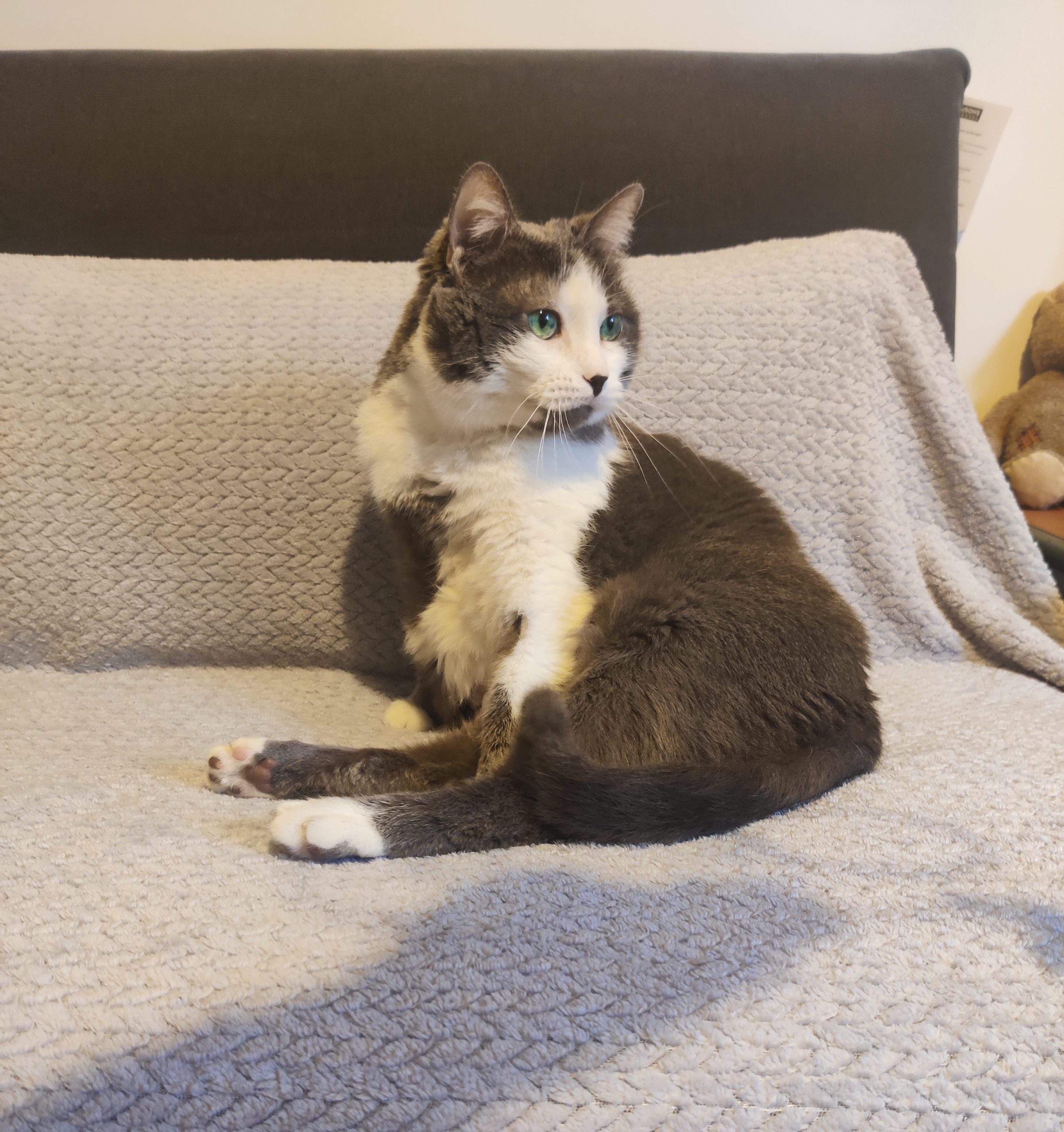 Caractéristiques physiques : Chat assez corpulent, robe grise et blanche, avec de grands et magnifiques yeux verts, Testé FIV+/FelV-, vaccination en cours, castré et identifié par puce électronique.