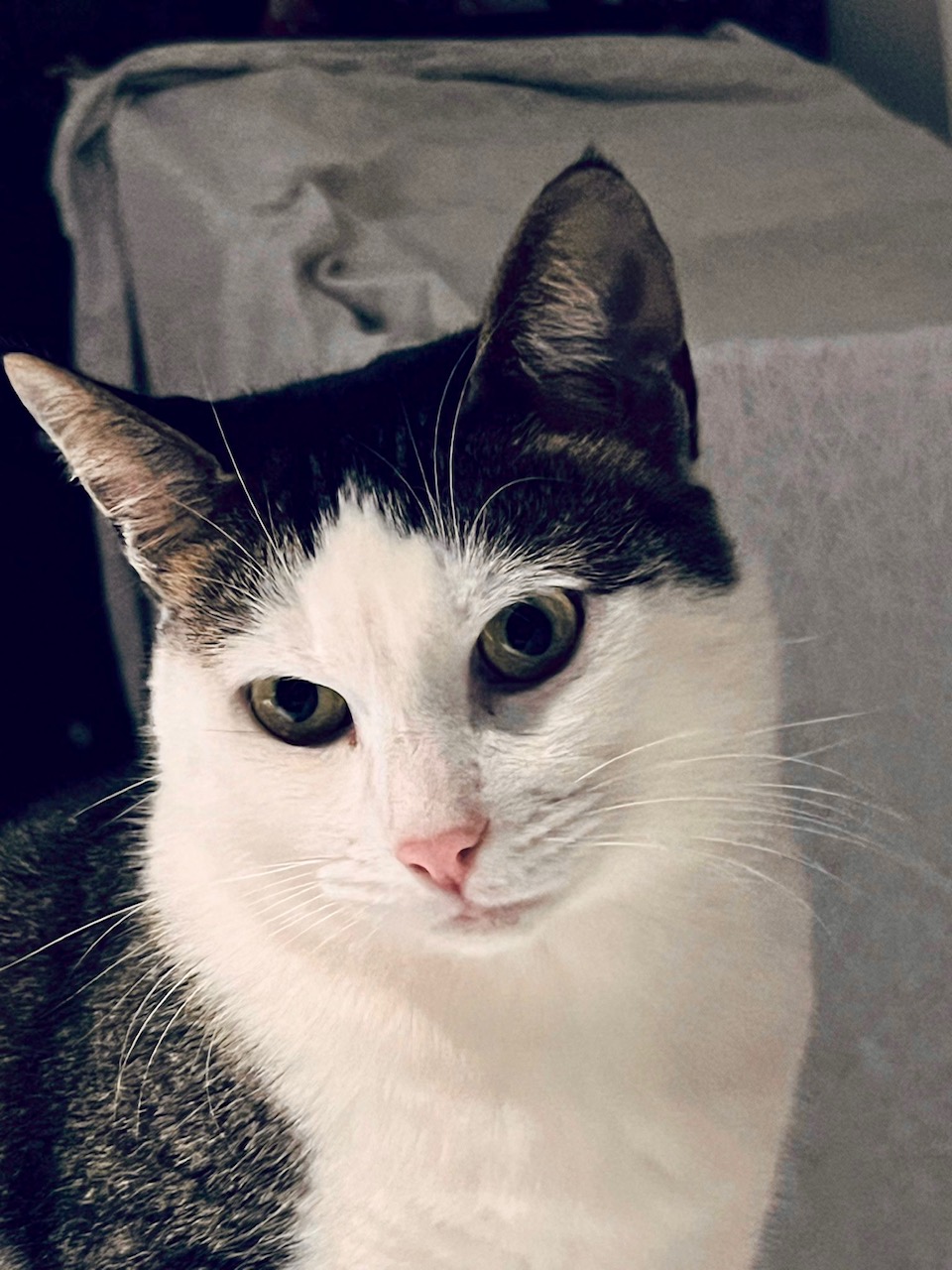 Caractéristiques physiques : adorable minette blanche et tigrée grise.