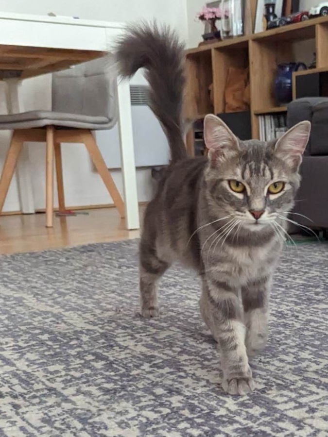Caractéristiques physiques : pelage tigré gris, mi-long; yeux jaunes, queue en panache. Test FeLV/FIV négatif. Vaccinée, stérilisée et identifiée par une puce électronique.