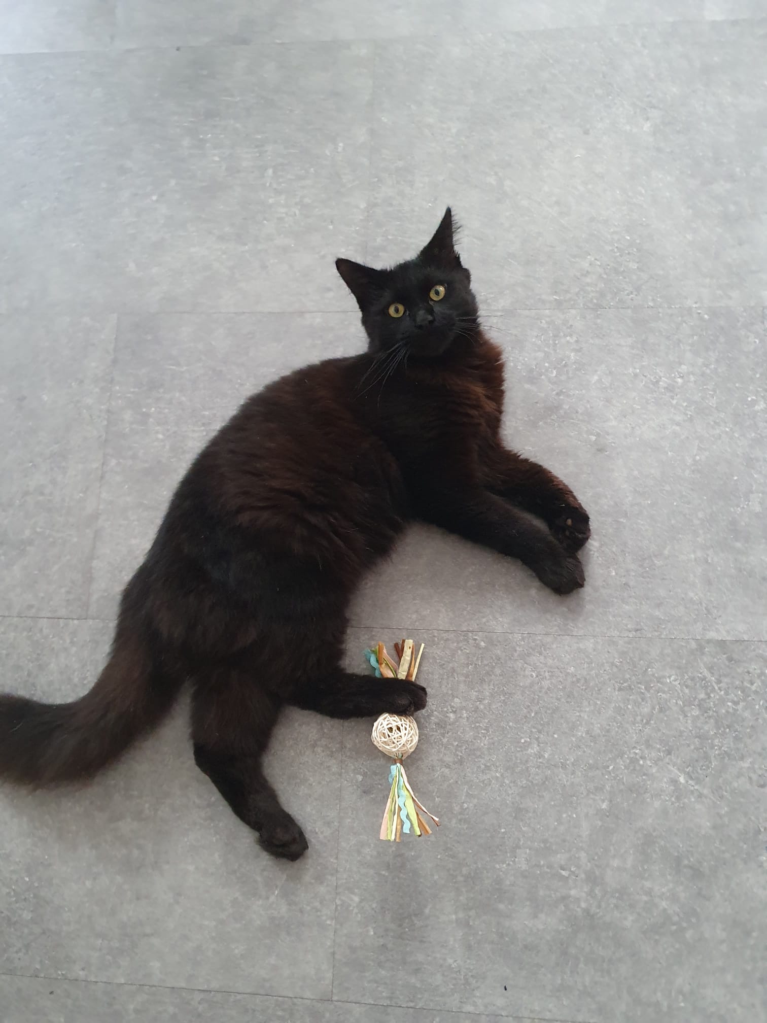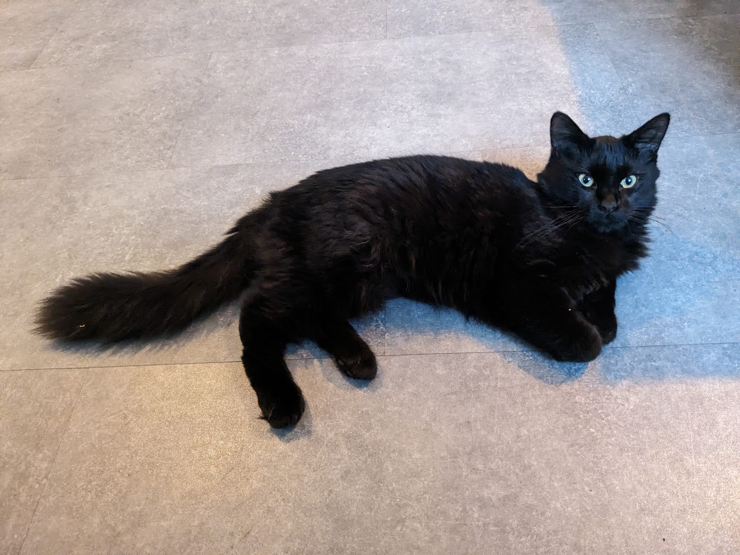 Caractéristiques physiques : beau pelage noir, poil mi-long avec une queue en panache. Yeux dorés.