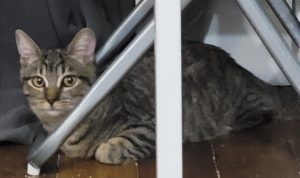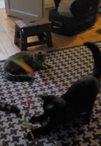 Aloès émet un petit « crach » quand elle vous regarde, ce n’est pas méchant mais une sorte de protection pour elle quand elle ne connait pas. Il suffit de se mettre à sa hauteur, sans gestes brusques et lui parler. Elle se laisse porter et peut rester un moment dans les bras bien tenue sinon elle se faufile. Elle aime ronronner, qu’on lui caresse le ventre. Elle observe beaucoup et vous analyse. Elle adore jouer et la confiance ainsi se met en place, mais c’est un peu où elle veut quand elle veut. Après la sieste elle adore les caresses.