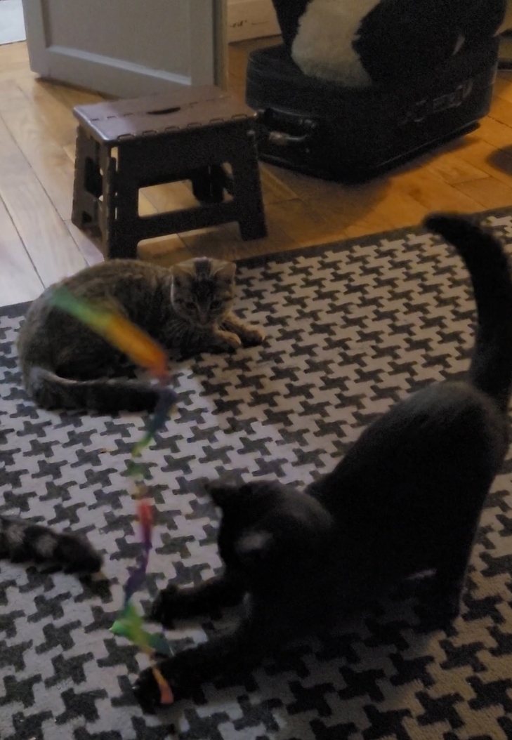 Calissa lui ressemble beaucoup, lui laisser un peu de temps pour s’adapter mais dès la confiance acquise elle se laissera faire pour les caresses, câlins en fermant les yeux. Elle aussi observe beaucoup, mange bien, adore jouer, aime ses congénères mais surtout complice avec sa soeur.