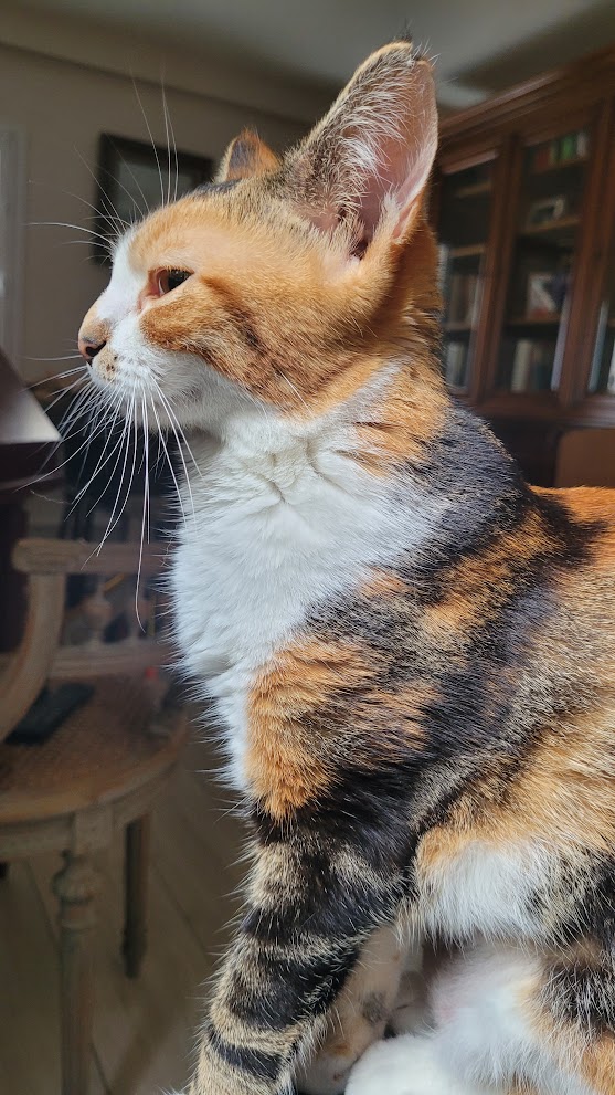 Placement idéal : dans un foyer aimant et responsable, avec de la compagnie (famille avec enfants déjà grands ou un autre animal) pour qu’elle ne soit pas trop souvent seule. Un balcon sécurisé serait un plus. Adoptée en septembre 2024.