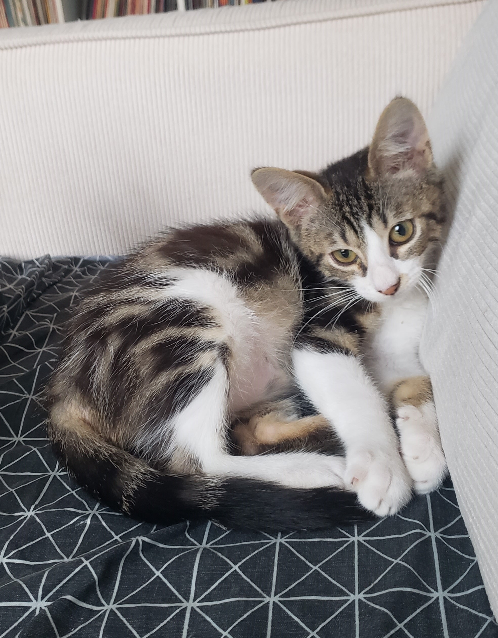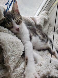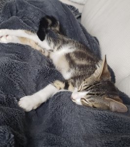 Caractère : Diaki est un chaton qui revient de loin. Trouvé dans un piteux état, il a su se battre et il est maintenant plein de vie. Quand la machine à ronrons entrera en marche, il vous fera beaucoup de câlins. Diaki aime jouer avec des balles, sa canne à pêche et autres petites souris qu’il prend comme une proie. Il adore se reposer pour sa sieste dans son hamac. Très curieux, il s’adapte très vite à un nouvel environnement. C’est un chaton propre et bien dans ses pattes. Il dormira sans doute sur votre lit ou dans son coussin favori. Il fera ses griffes sur le griffoir en carton et viendra également se reposer contre vous ou sur vous. Il est très autonome et se laisse manipuler très facilement.
