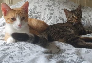 Caractéristiques physiques : Dina chatonne tigrée, Baptiste petit roux et blanc. Testés négatifs Fiv/FeLV, ils sont vaccinés et seront stérilisés à l’âge de 6 mois par l’association.