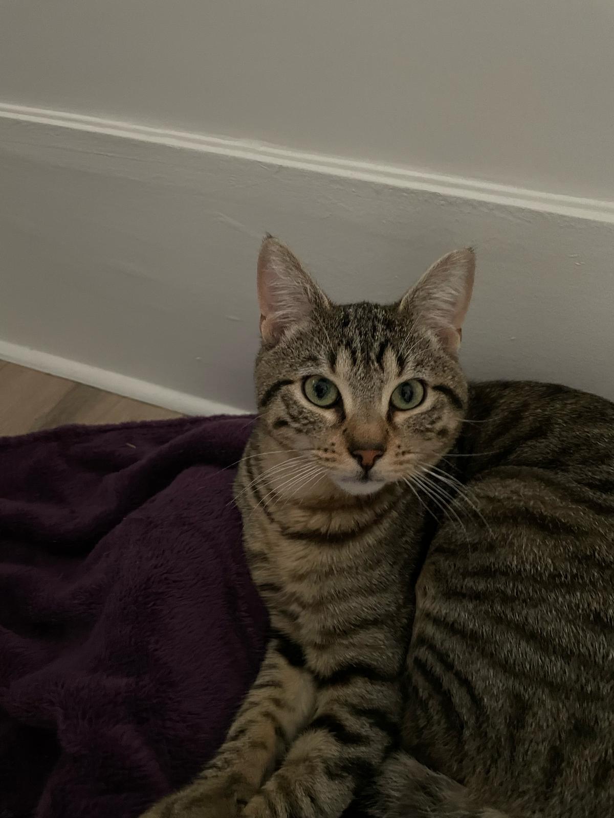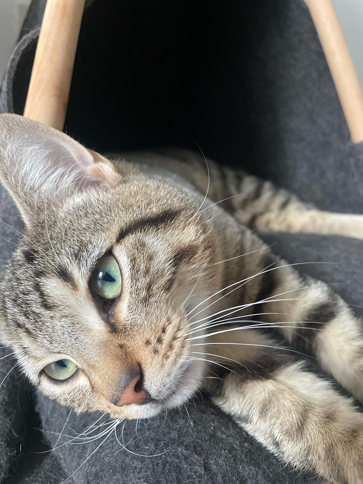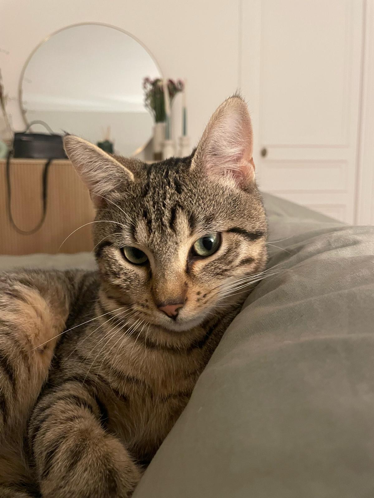 Caractéristiques physiques : Joli chat tigré aux yeux verts.