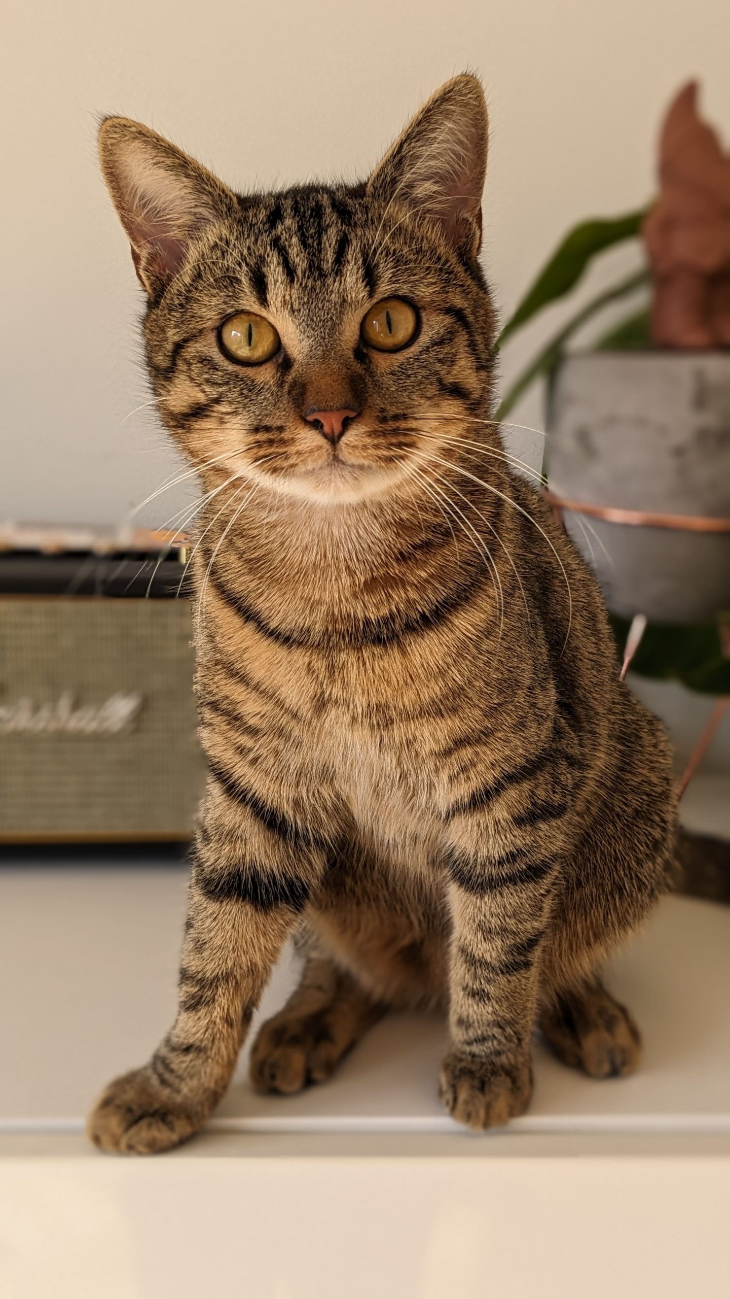 Caractéristiques physiques : chat tigré marron/blanc/beige.