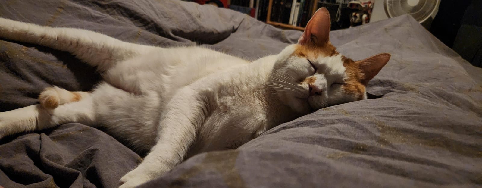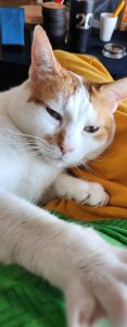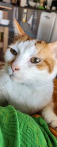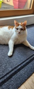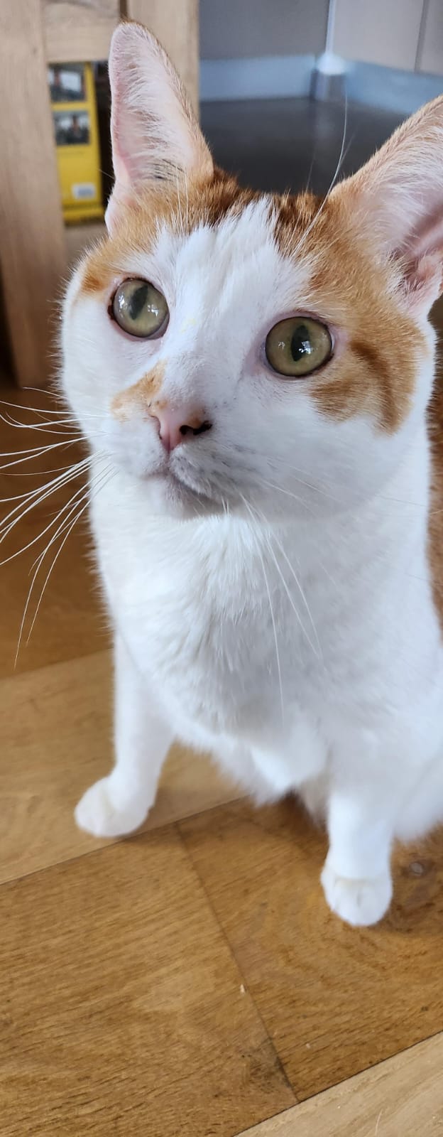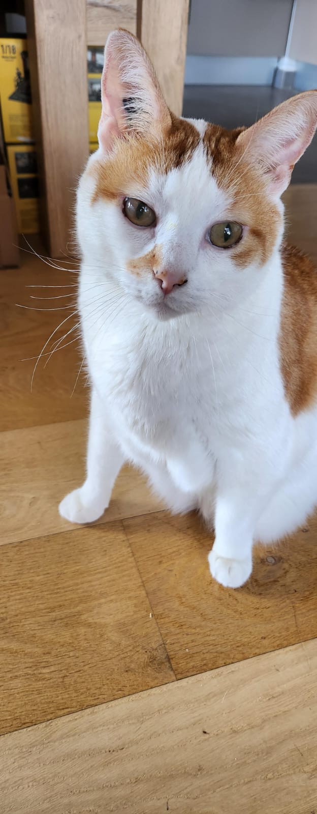 Caractéristiques physiques : Beau chat roux et blanc un peu en surpoids, aux yeux verts. Testé FeLV et FIV négatif, vacciné, stérilisé et identifié par une puce électronique.