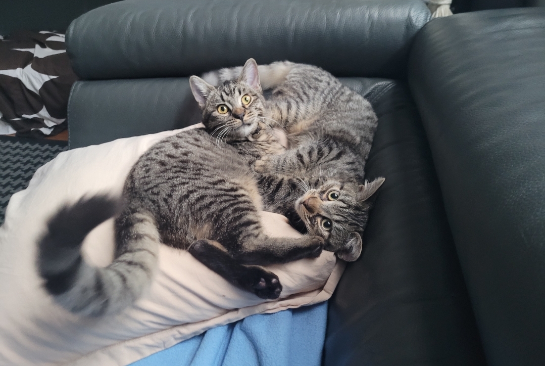Caractéristiques physiques : chats tigrés gris/noir, poils courts doux .Testés négatifs Fiv/FeLV, ils sont vaccinés et seront stérilisés à l’âge de 6 mois.