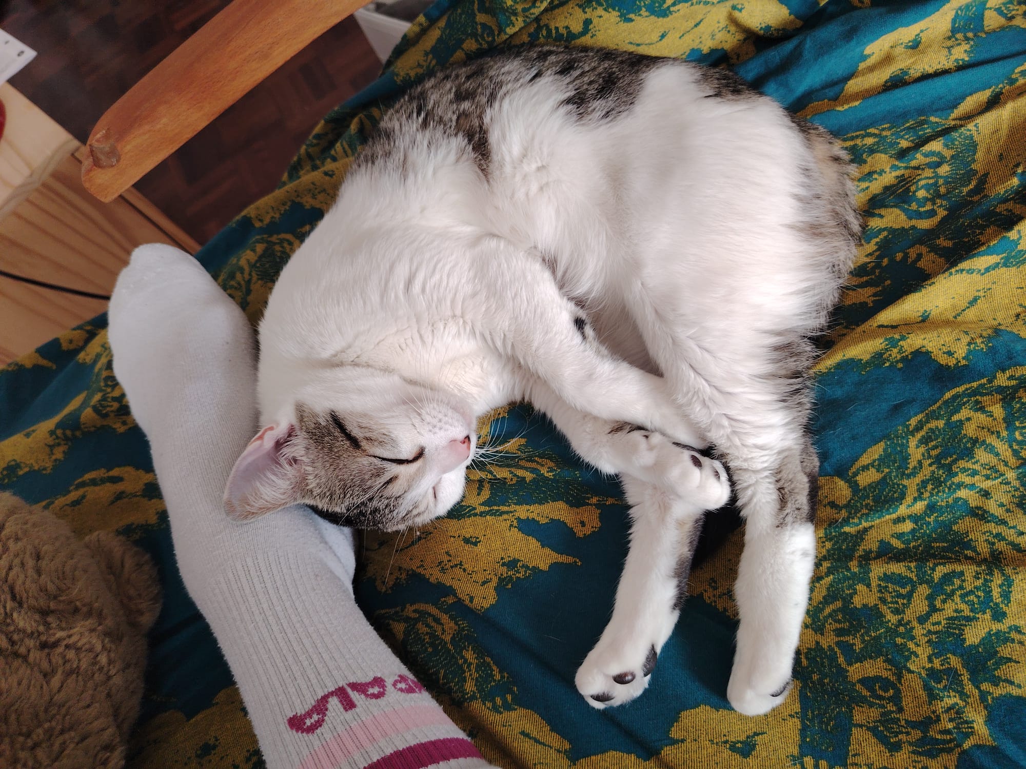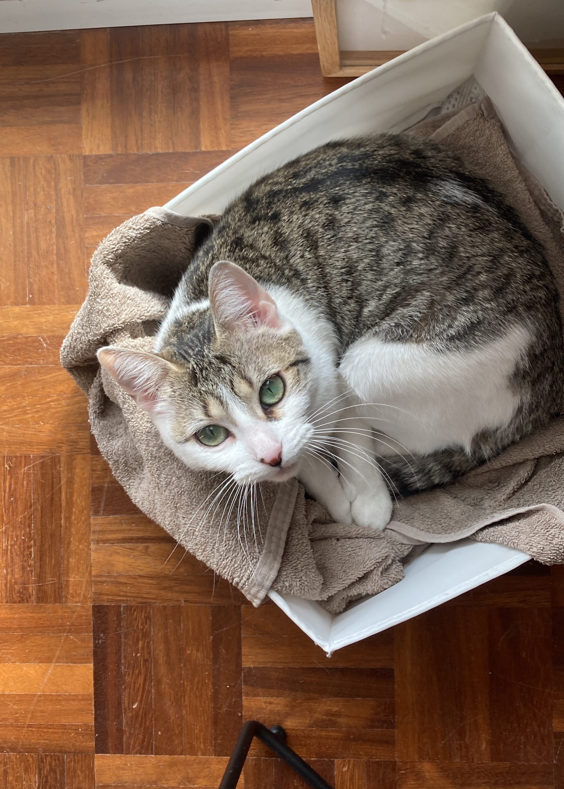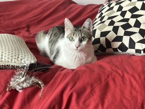 Elle est très gentille et ne griffe pas, elle se laisse porter et embrasser sans problème, pour autant, elle n’aime pas rester dans les bras très longtemps. Elle ne ronronne pas facilement, ni ne grimpe naturellement sur les genoux : il lui faut un temps d’adaptation à sa nouvelle famille pour être en confiance et devenir affectueuse. Cela n’empêche qu’elle recherche la compagnie et reste à côté de vous où que vous soyez dans la maison. Elle aime aussi beaucoup jouer et réclamera votre participation quand c’est l’heure du jeu. Elle est très active la journée et semble s’ennuyer un peu en appartement : elle appréciera sans doute un accès extérieur pour aller se dégourdir les pattes ! La nuit elle aime nous rejoindre pour dormir au pied du lit. Mignonne on vous dit !