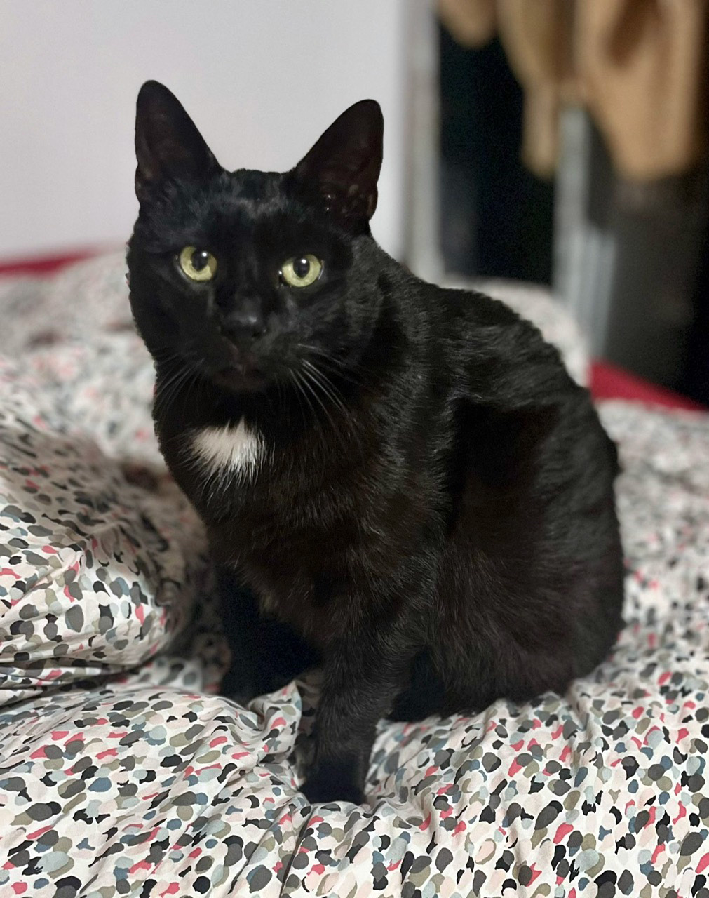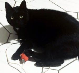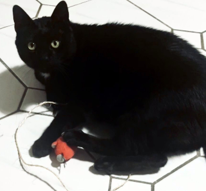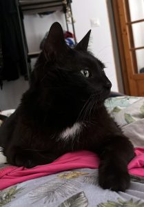 Caractéristiques physiques : très beau chat noir avec une tache blanche et aux beaux yeux verts.