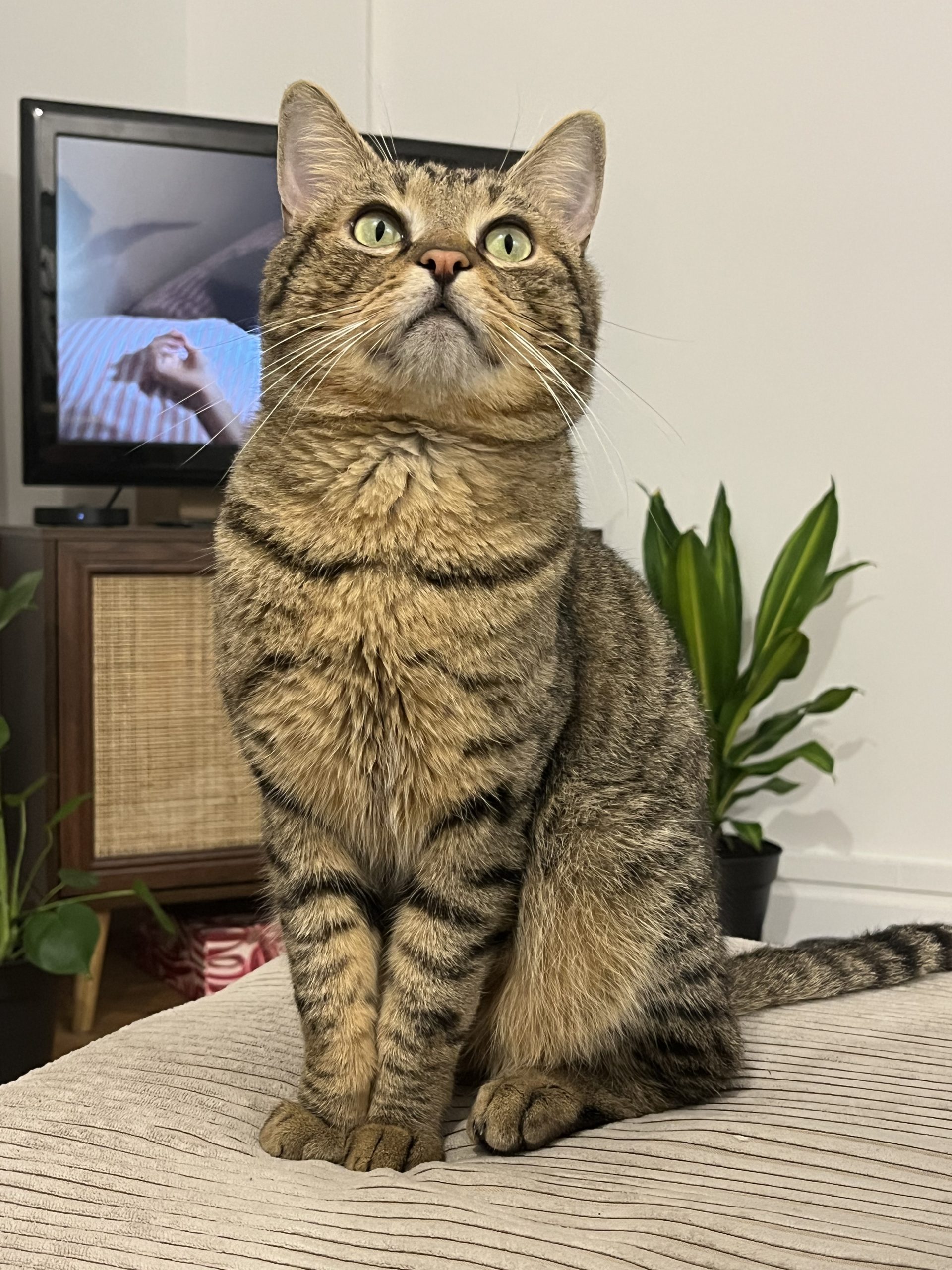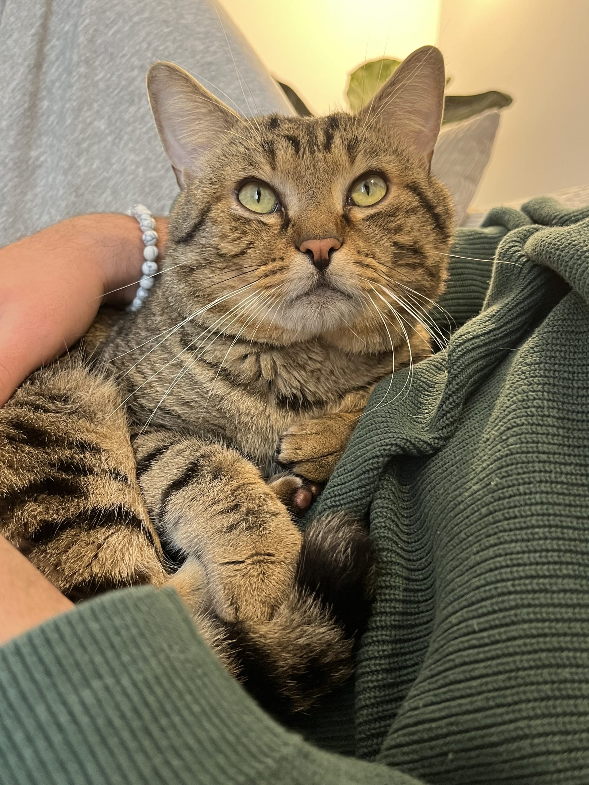 Il adore la présence humaine et déteste les portes fermées. Très câlin, il préfère être sur nos genoux que seul sur le canapé ou dans l’arbre à chat ! Comme un petit chien, il nous attend à la porte au retour du travail pour demander des câlins.