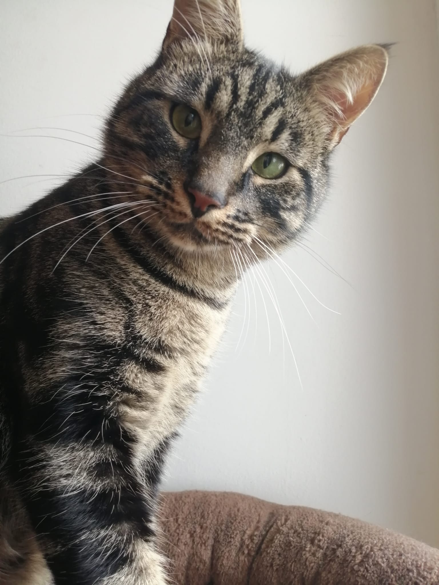 Caractéristiques physiques : beau pelage tigré, léger strabisme. Testé FeLV/FIV négatif, vacciné, stérilisé et identifié par une puce électronique.