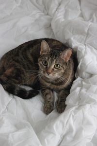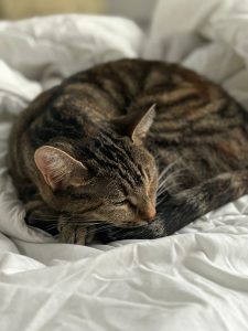 Quand elle ne fait pas la sieste, elle adore se frotter contre vos jambes pour vous saluer, vous rappeler qu’il est l’heure de manger, ou simplement pour s’installer sur vos genoux.