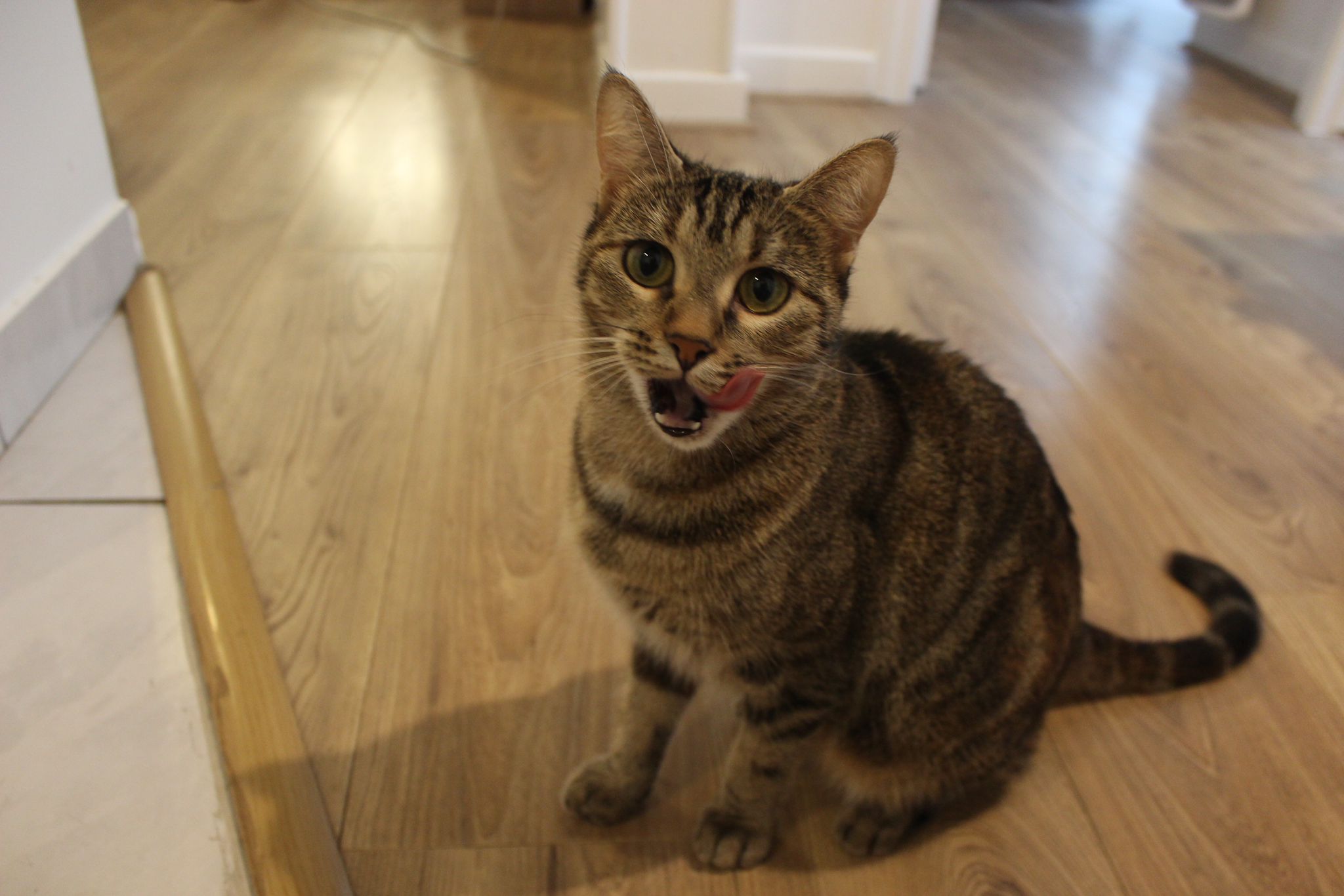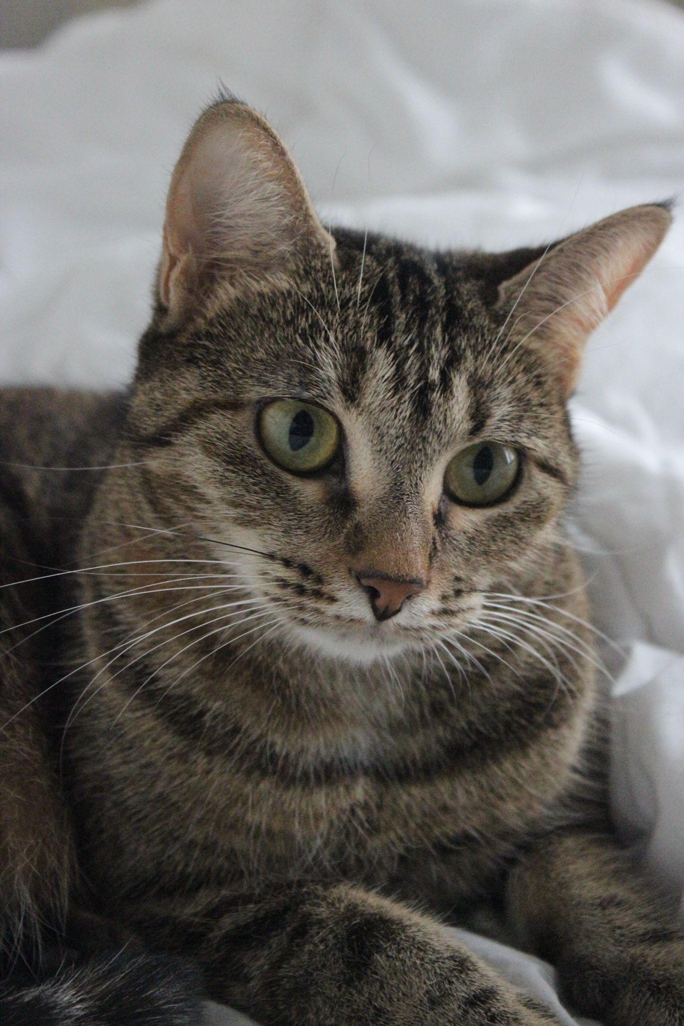 Caractéristiques physiques : doux pelage tigré avec des beaux yeux verts. Elle a une belle dentition avec deux petites canines en avant, ce qui lui donne une particularité très mignonne.