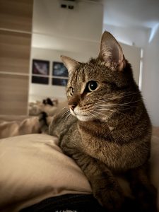 Caractère : Stelty est une chatte très affectueuse et dynamique. Très gentille, elle n’a peur de rien, mais apprécie les caresses et les contacts humains. Elle n’aime pas être portée. Très observatrice de ce qui se passe au dehors, elle joue, se défoule la journée. La nuit, elle sort seule ou vient se poser sur le lit à côté de vous. Elle est très propre, gourmande et bavarde quand elle a faim, sa préférence étant la pâtée qu’aux croquettes. Cette petite chatte aime gambader dans son espace, se retrouver sur une porte, un meuble et adore son arbre à chat d’où perchée en hauteur elle peut dominer la situation. Elle a ses moments de pause et de câlins aussi.